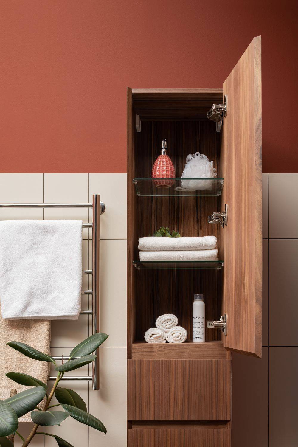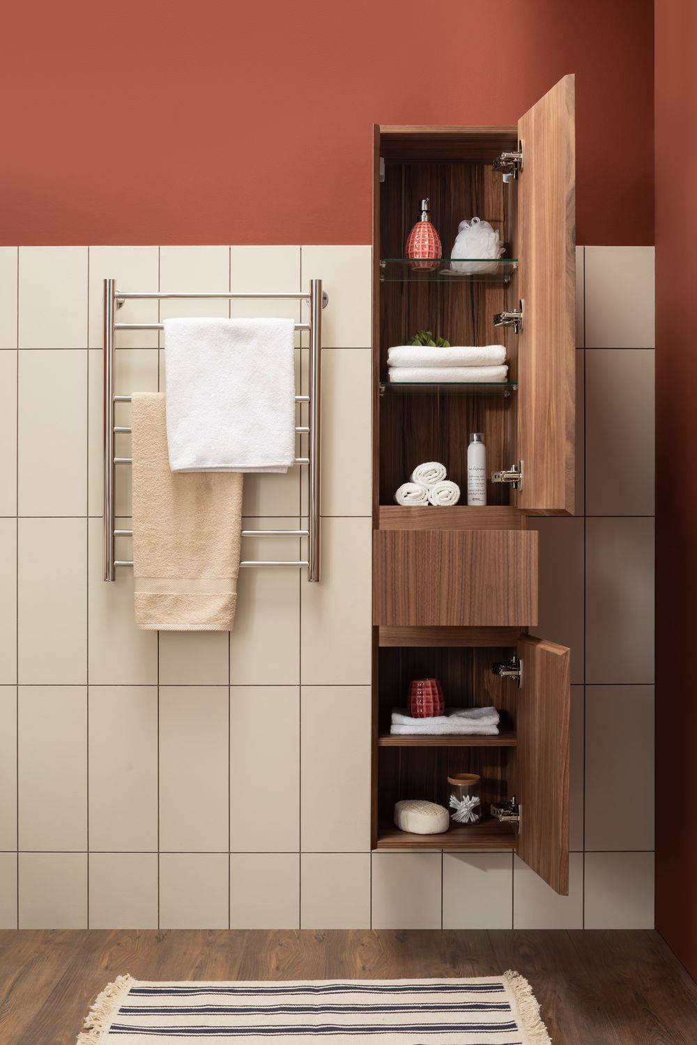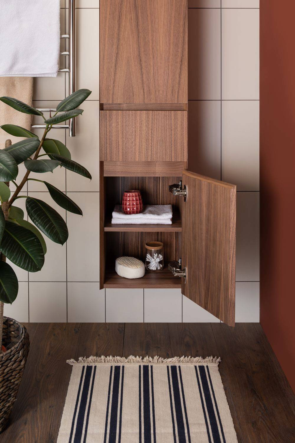 Шкаф-пенал для ванной Aquanet Нью-Йорк 35 (орех) не нуждается в дополнительных декоративных деталях, живописной фурнитуре – шпон ореха, используемый в качестве покрытия, выполняет функции декорирования наилучшим образом. А для открывания дверок пенала и выдвижения ящичка торцевые детали фасадов снабжены специальными скосами, что превращает их в удобный элемент открывания. Это и есть так популярные сейчас интегрированные ручки. Корпус традиционно для мебели Aquanet выполнен из влагостойкой ЛДСП, фасады – из МДФ. Пенал имеет универсальный способ установки, то есть его можно подвесить, а можно и установить на ножки. Он предоставляет дополнительные места хранения к базовому комплекту мебели, в который входит только тумба и зеркальный шкафчик. Зона хранения пенала шириной 35 см и высотой 162,5 см распределена по пяти полочкам, скрытым за двумя распашными дверцами и ящичком, расположенным между ними.
