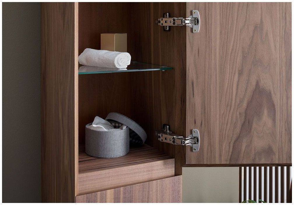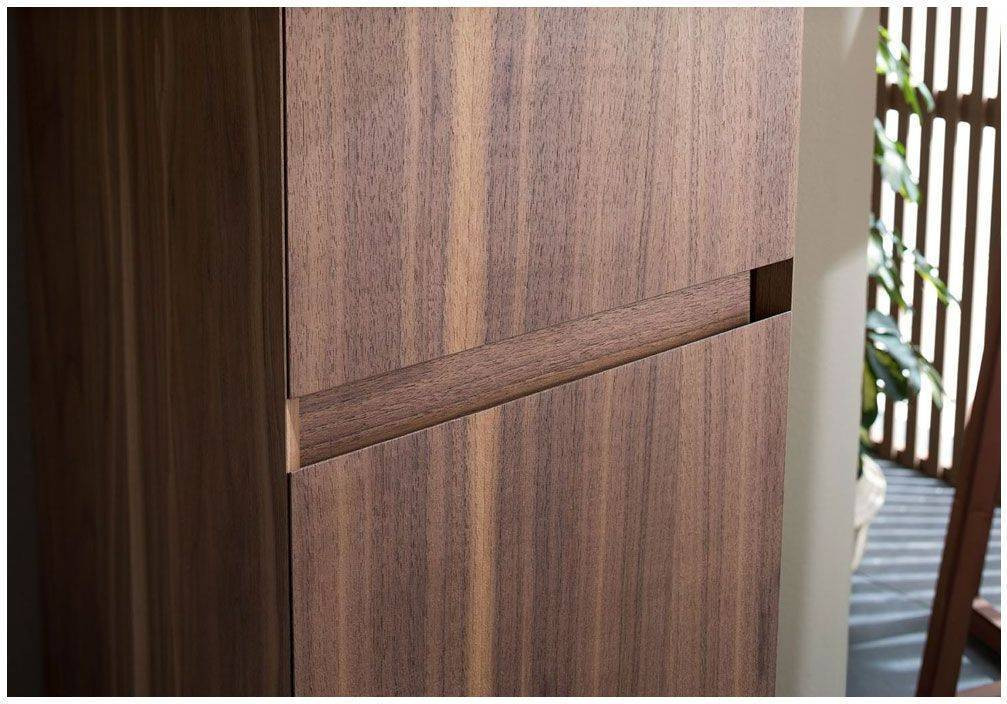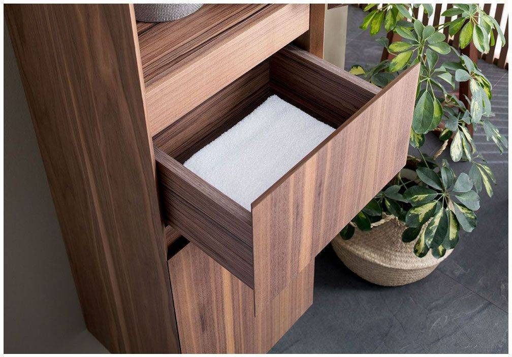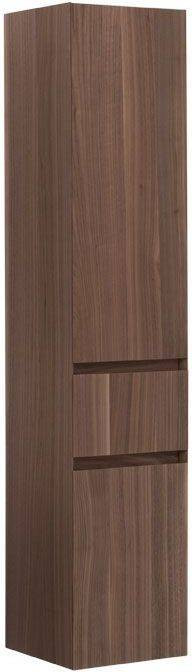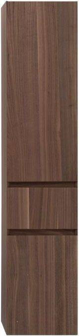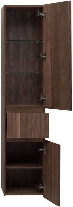 Шкаф-пенал для ванной Aquanet Нью-Йорк 35 (орех) не нуждается в дополнительных декоративных деталях, живописной фурнитуре – шпон ореха, используемый в качестве покрытия, выполняет функции декорирования наилучшим образом. А для открывания дверок пенала и выдвижения ящичка торцевые детали фасадов снабжены специальными скосами, что превращает их в удобный элемент открывания. Это и есть так популярные сейчас интегрированные ручки. Корпус традиционно для мебели Aquanet выполнен из влагостойкой ЛДСП, фасады – из МДФ. Пенал имеет универсальный способ установки, то есть его можно подвесить, а можно и установить на ножки. Он предоставляет дополнительные места хранения к базовому комплекту мебели, в который входит только тумба и зеркальный шкафчик. Зона хранения пенала шириной 35 см и высотой 162,5 см распределена по пяти полочкам, скрытым за двумя распашными дверцами и ящичком, расположенным между ними.