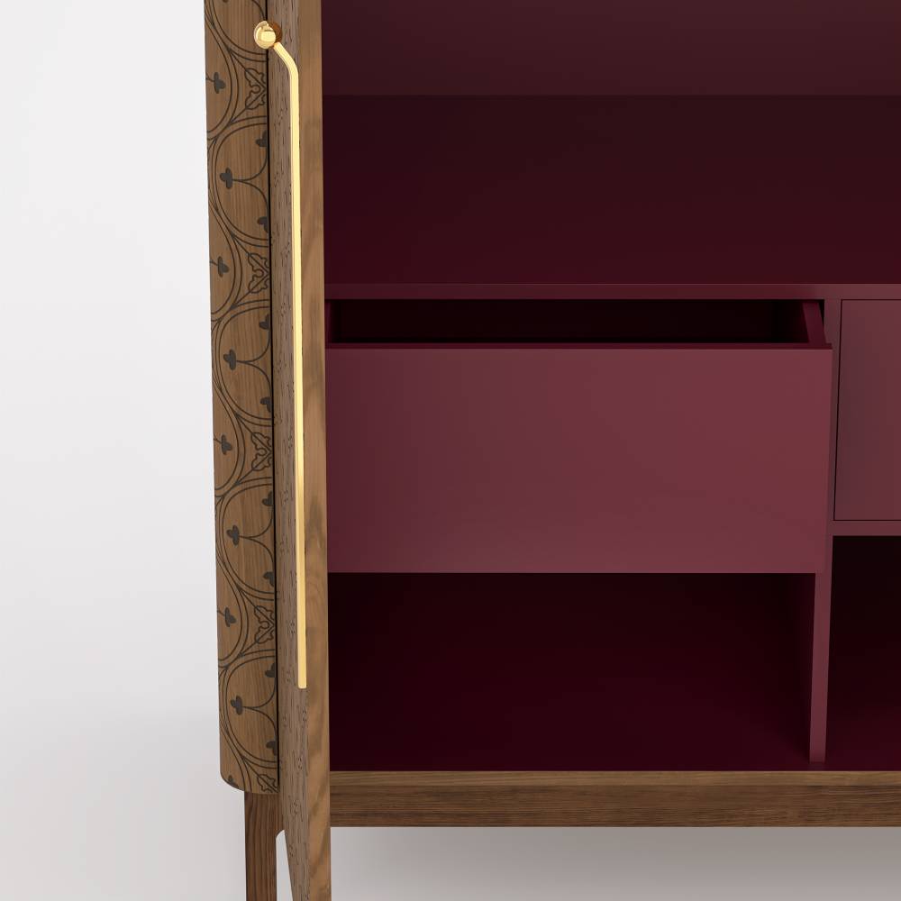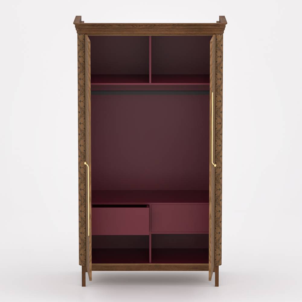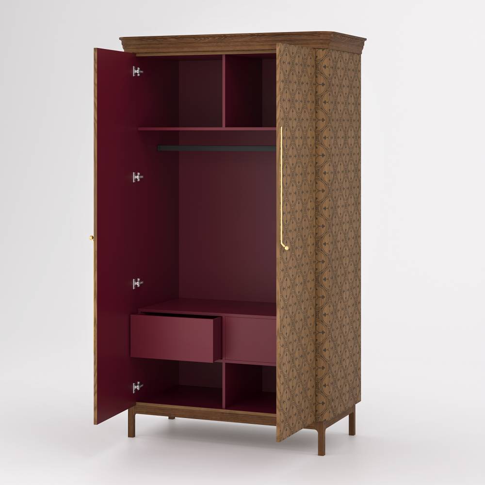 Деревянный шкаф с бордовым внутренним оттенком — сочетание элегантности и практичности. Идеален для хранения вещей и декора, добавляя интерьеру выразительный акцент.