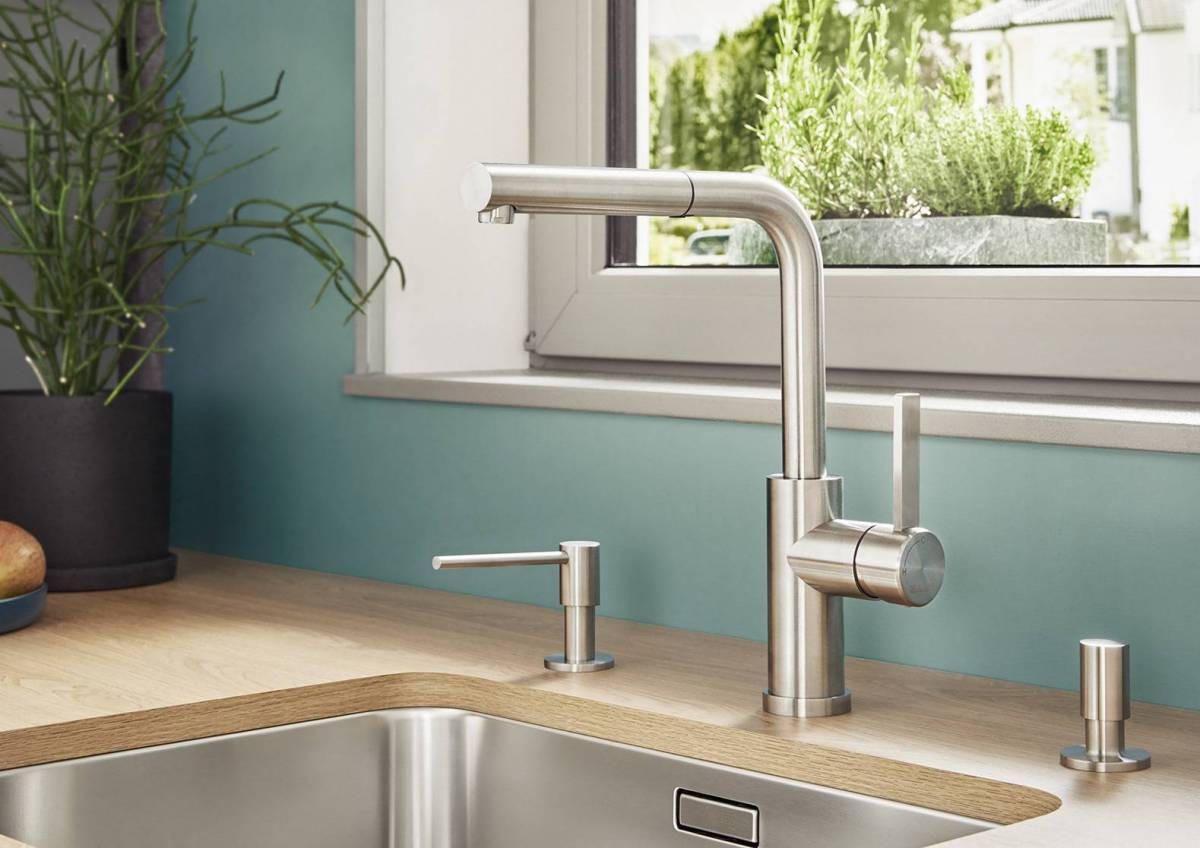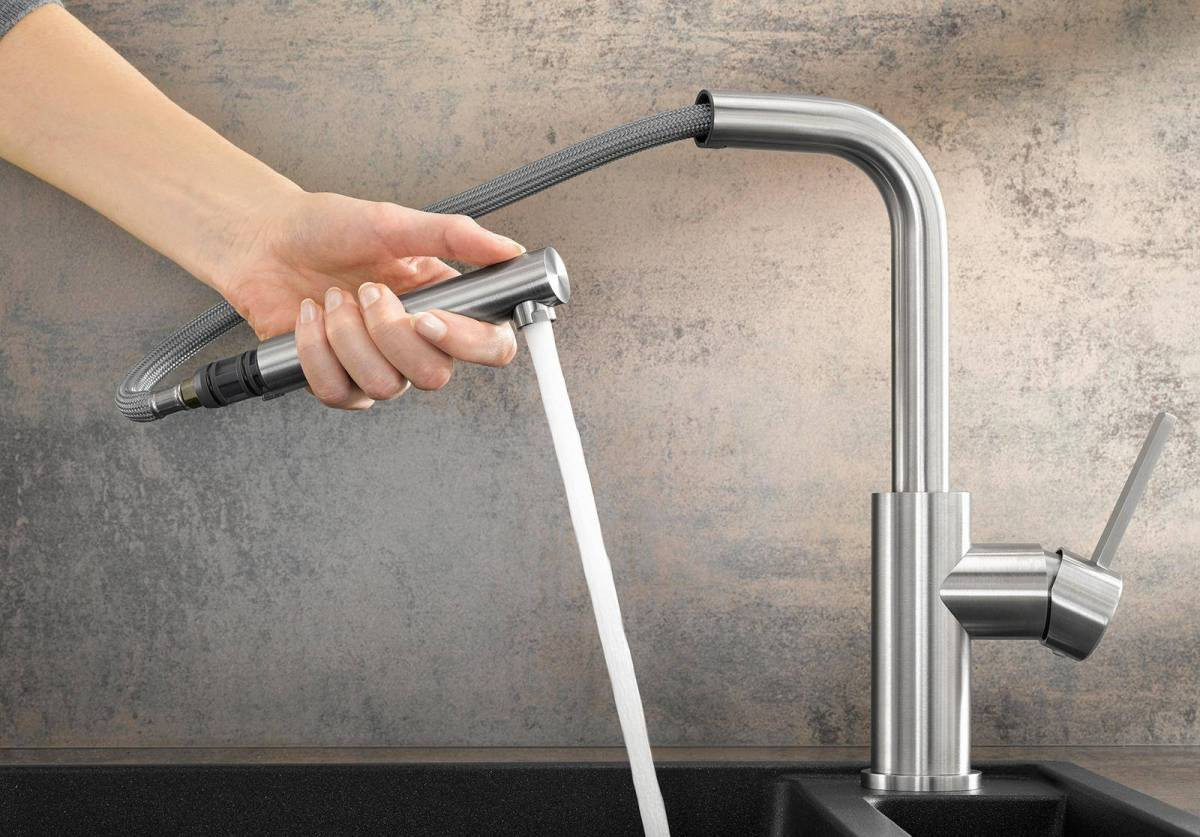 Высокий выдвижной носик для удобного наполнения кастрюль, ваз и для удобства ухода за большими мойками.