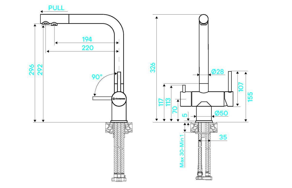 Смеситель KÜCHENSTERN FOKUS-FS объединяет сразу две функции - питьевая и обычная вода из одного смесителя.