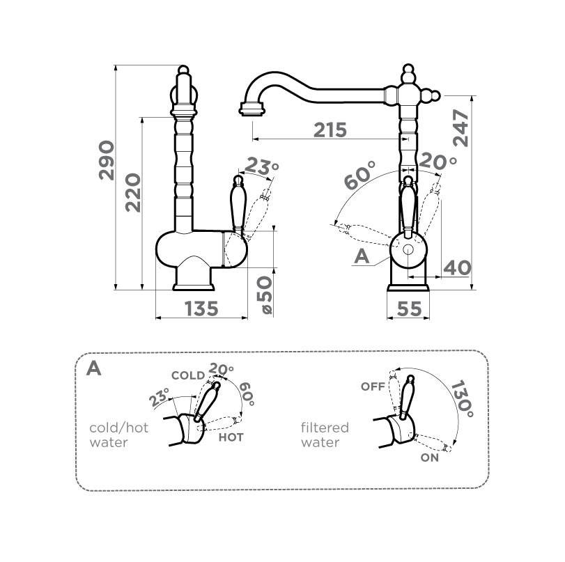 Новая удобная технология системы ручки 2 в 1 Multi позволяет переключить с водопроводной на фильтрованную воду в одно касание.