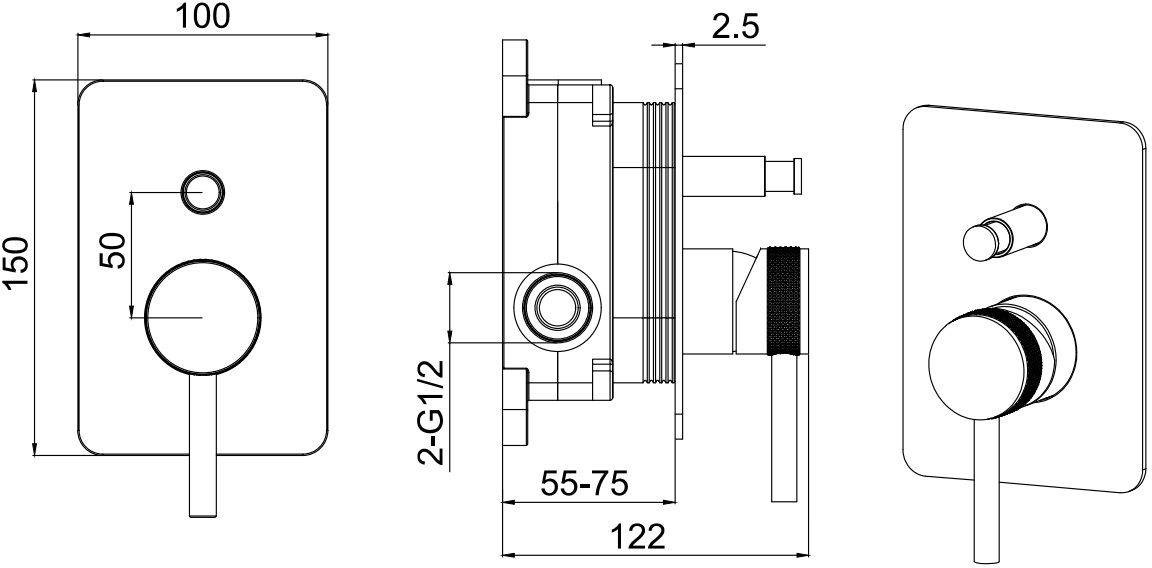 Встраиваемый смеситель на 2а потребителя воды, дополнительно приобретается оборудование на 2а потребителя (Пример: №1 верх.душ + №2 душевой набор с водорозеткой ИЛИ другие комбинации из 2х элементов)