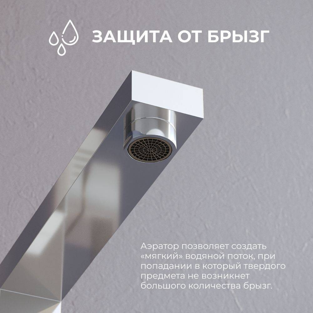 •Излив с аэратором, который насыщает воду воздушными пузырьками, что позволяет получить больший охват при этом происходит экономичный расход воды, а также исключается возможность разбрызгивания.