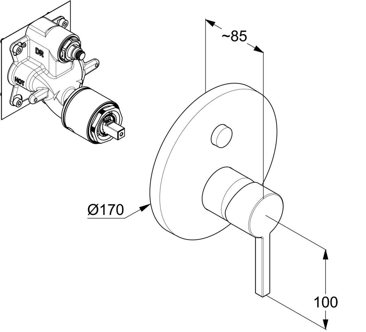 Технология 1: Керамический картридж с ограничителем горячей воды, PUSH&SWITCH - кнопочный переключатель душ/ванна