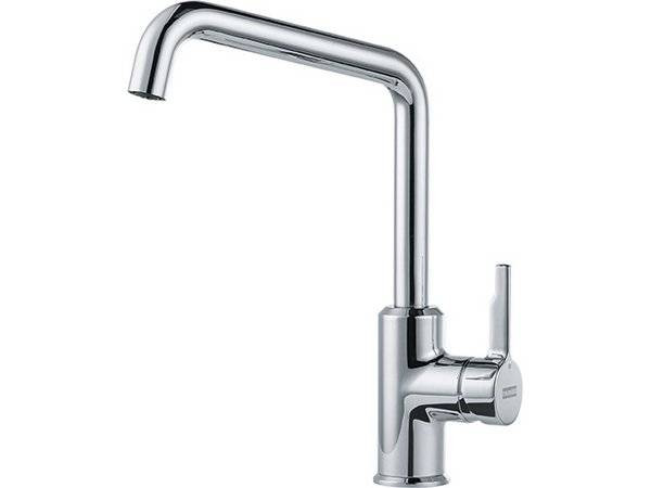 Смеситель современного дизайна с поворотным изливом. Форма ручки смесителя повторяет рисунок крыла мойки из серии Urban, поэтому дуэт выглядят как одно целое. На фасаде рычага управления размещен логотип производителя.