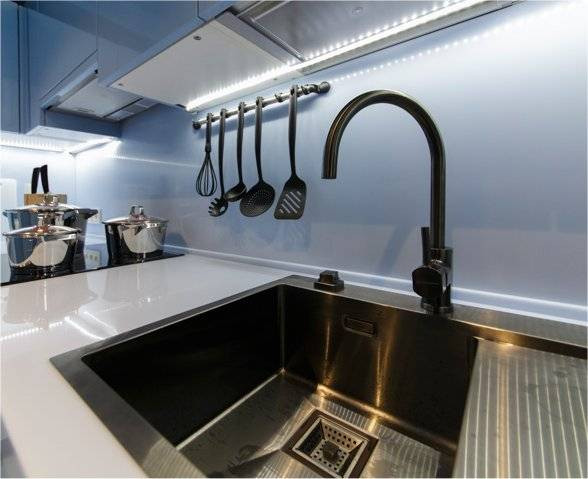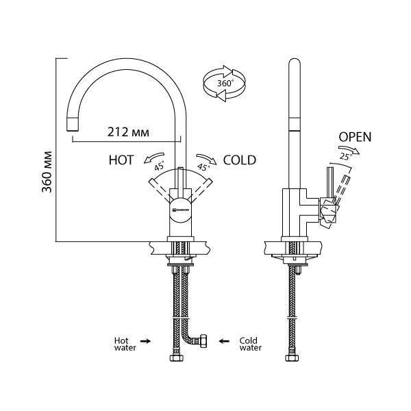 Современный дизайн и удобство использования, благодаря высокому изливу.
