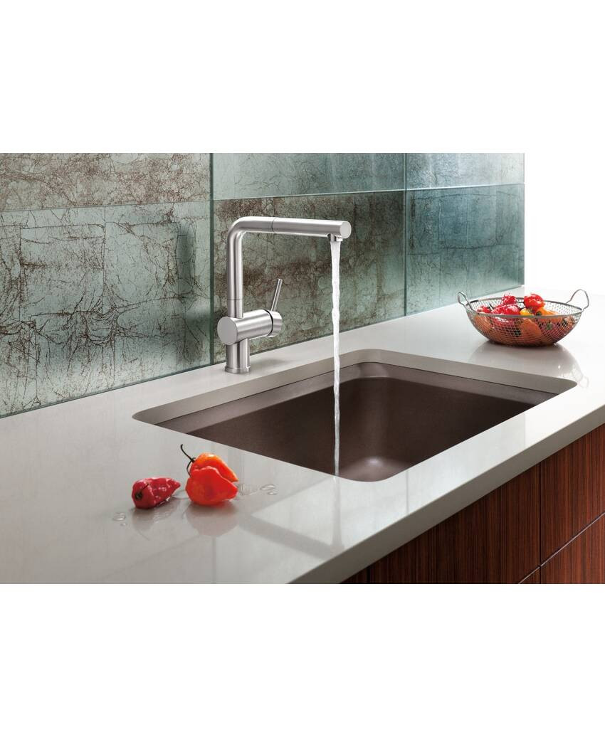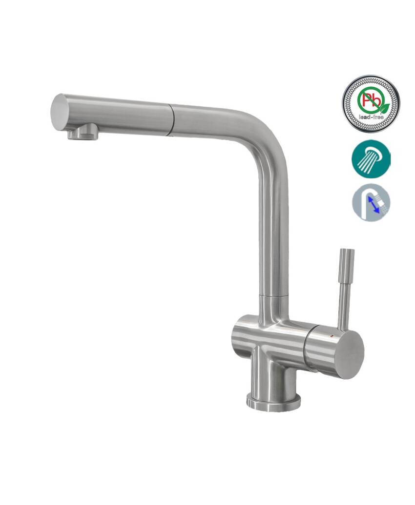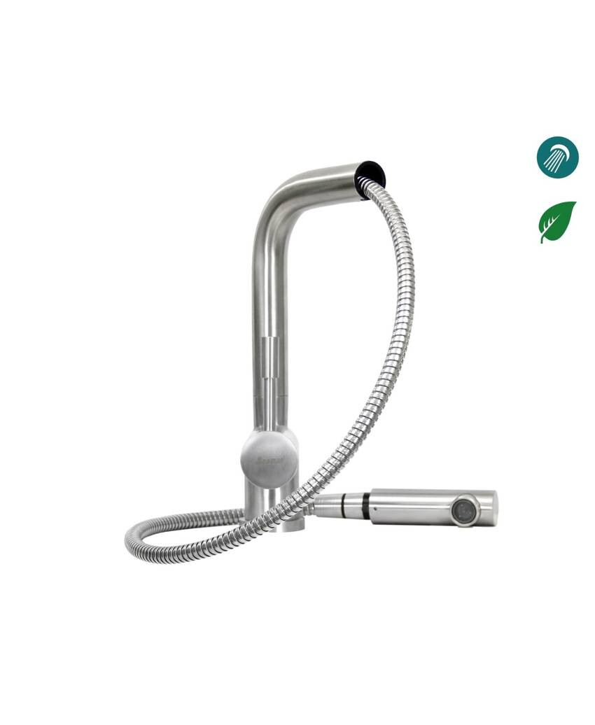 Выдвижной излив — съемный излив с гибким шлангом, позволяет удобно использовать излив основной воды как при мытье продуктов и мойке чаши, так и при наполнении кастрюль и др. емкостей. Благодаря использованию стальной пружины в возвратном механизме лейки достигается максимальное использование всей длины выдвижного шланга и излив комфортно и надежно паркуется на посадочном месте.