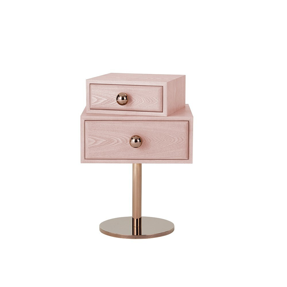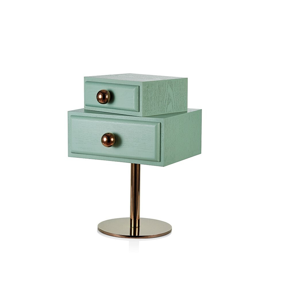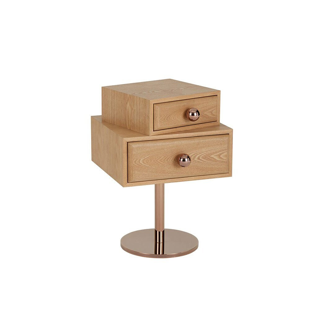 Сложный асимметричный силуэт создаёт ощущение движения, а два независимых выдвижных ящика, расположенных друг над другом, делают модель функциональной и выразительной. Несмотря на визуальную динамику, столик устойчиво закреплён на элегантной круглой ножке из латуни или металла с розовато-медной отделкой.