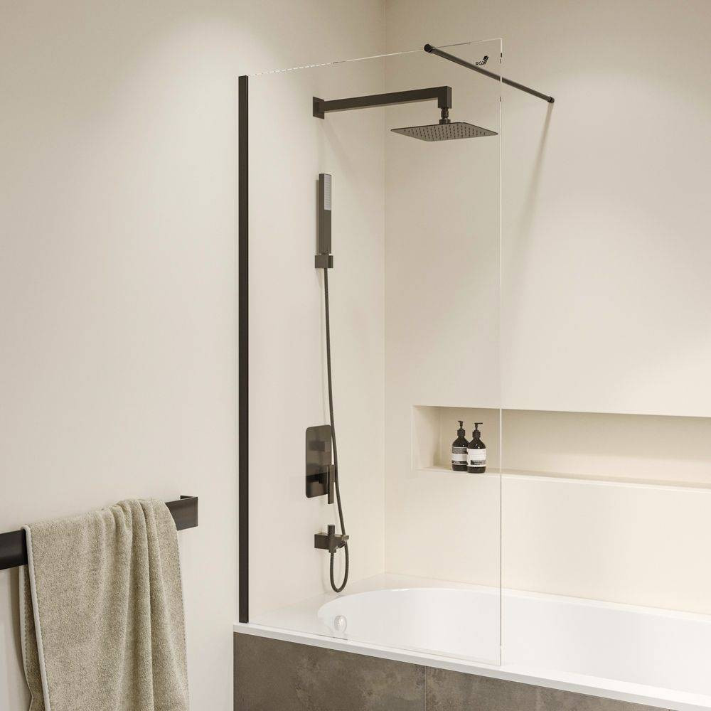 Преимуществом данной шторки является прозрачное стекло, что создает визуальное ощущение пространства, а также черный цвет профиля, который прекрасно сочетается с любым дизайном ванной комнаты. Высота шторки составляет 1500 мм, что позволяет использовать ее в большинстве стандартных размеров ванн.