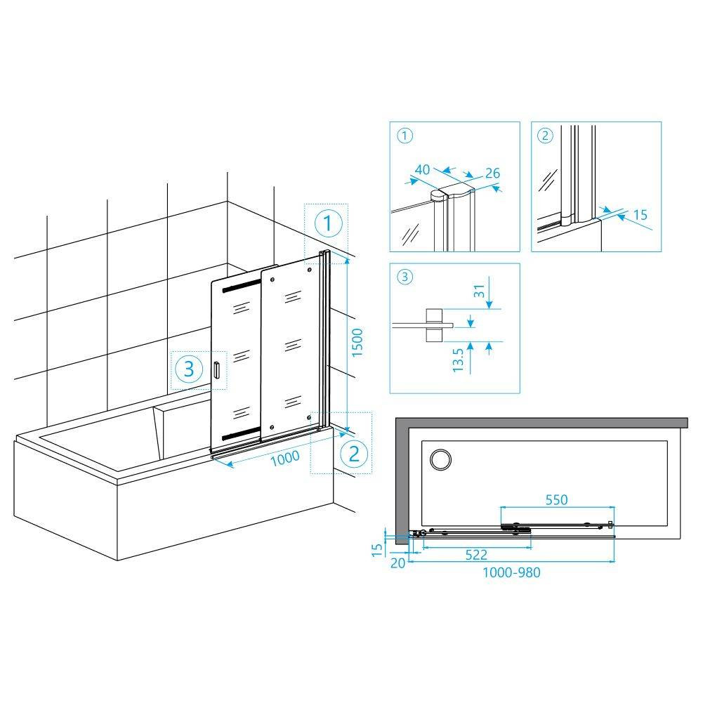 Высота стеклянной шторки составляет 1500 мм, что вполне достаточно для большинства ванных комнат. Ресурс эксплуатации составляет 15 лет, что гарантирует долгий период бесперебойной работы шторки.