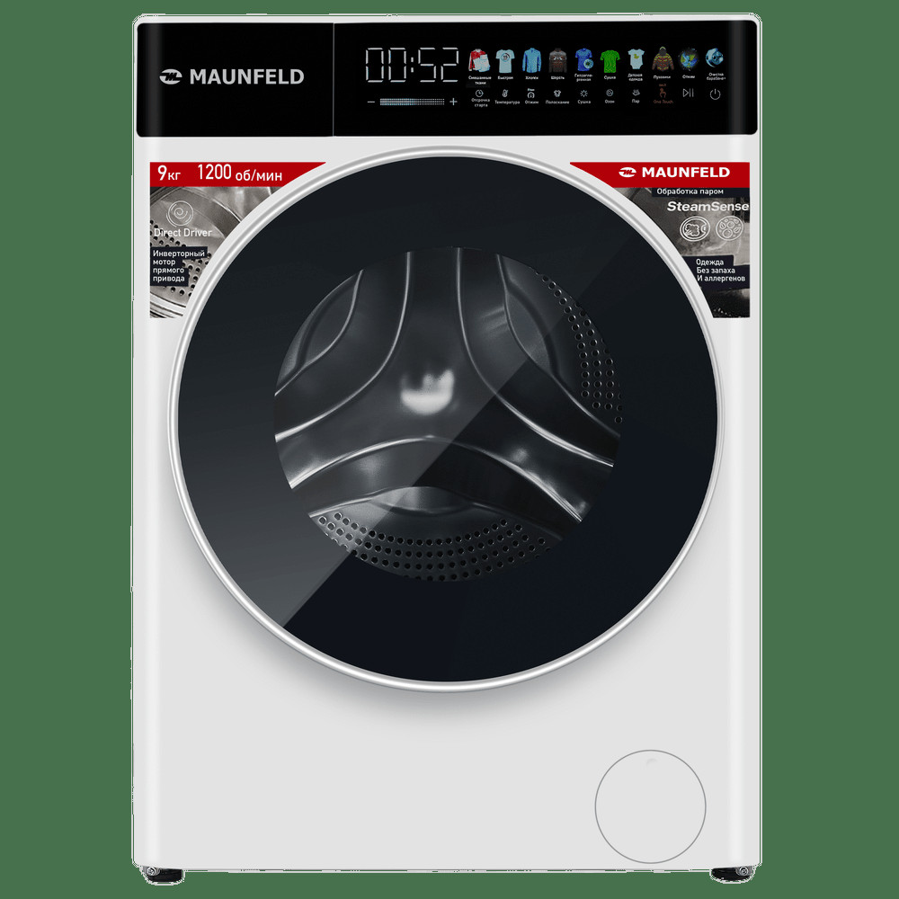 прямым приводом, инверторным двигателем и функцией пара. Показатель загрузки стиральной машины — 9 кг белья, скорость отжима — до 1200 оборотов в минуту.