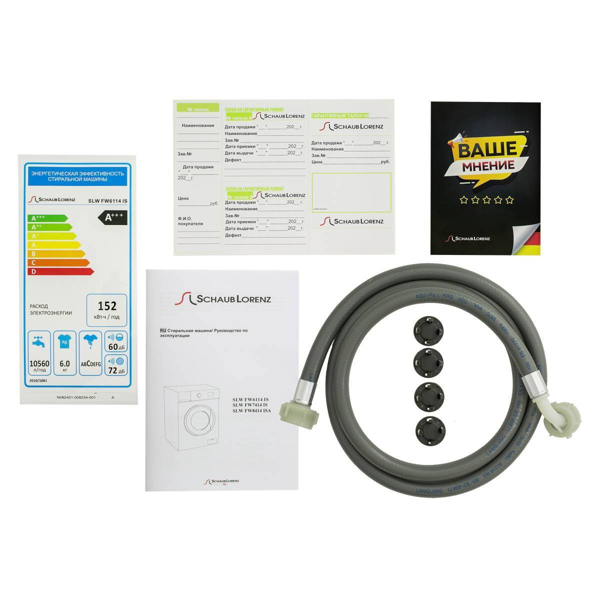 Комплектация: Шланг подачи воды, Сливной шланг, Инструкция по эксплуатации, Пластиковый держатель для сливного шланга