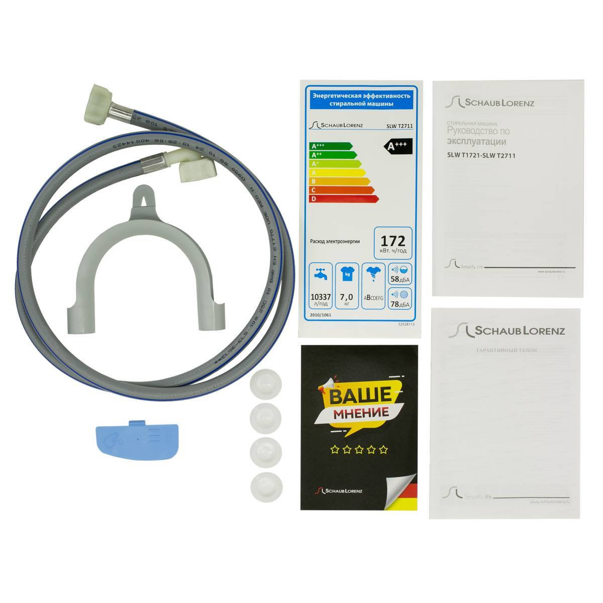 Комплектация: Шланг подачи воды, Сливной шланг, Инструкция по эксплуатации, Пластиковый держатель для сливного шланга