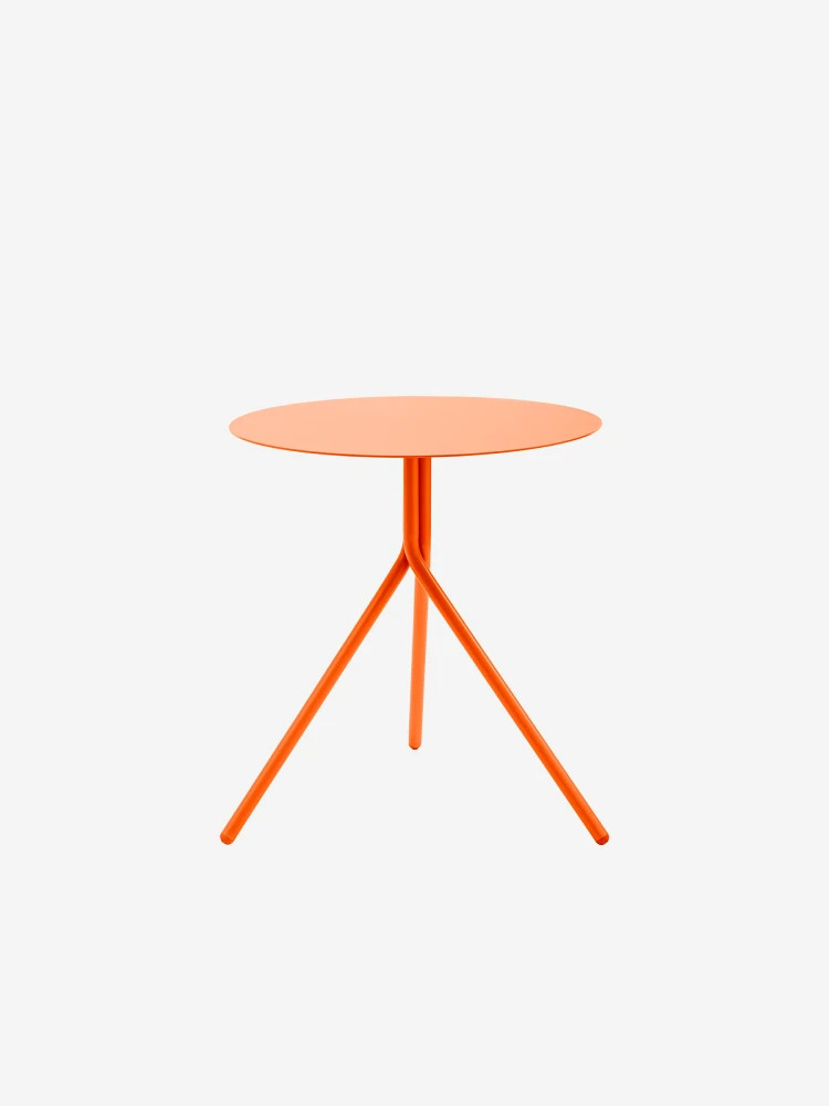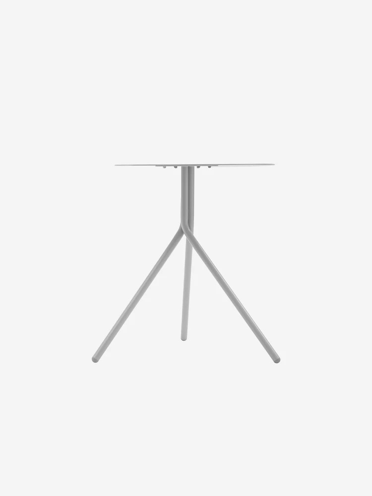 Столешница из листового металла 5мм и ножка, собранная из трёх гнутых стальных труб. Благодаря трём точкам контакта с поверхностью, стол надёжно стоит даже на неровных покрытиях.