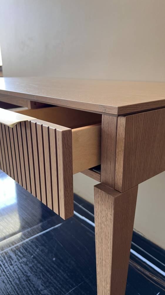 Письменный стол — это идеальное сочетание стиля и функциональности. С его современным дизайном и уютной атмосферой он станет прекрасным дополнением как для офиса, так и для дома. Прямоугольная столешница обеспечивает достаточно места для работы или организации рабочего процесса. Два выдвижных ящика данной модели письменного стола позволят удобно хранить все необходимые мелочи и документы рядом с рабочим местом. Ручки под латунь добавляют изысканности и стильности этому элементу мебели, придают ему особый элегантный вид. Ножки из массива дуба обеспечивают прочную и надежную основу для стола, при этом придавая ему природный и натуральный вид. Этот письменный стол станет не только практичным элементом в вашем интерьере, но и стильным декоративным акцентом, подчеркивающим ваш индивидуальный вкус и предпочтения