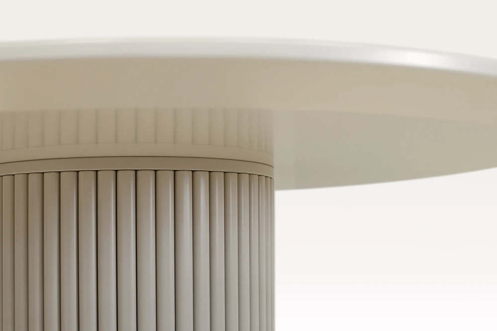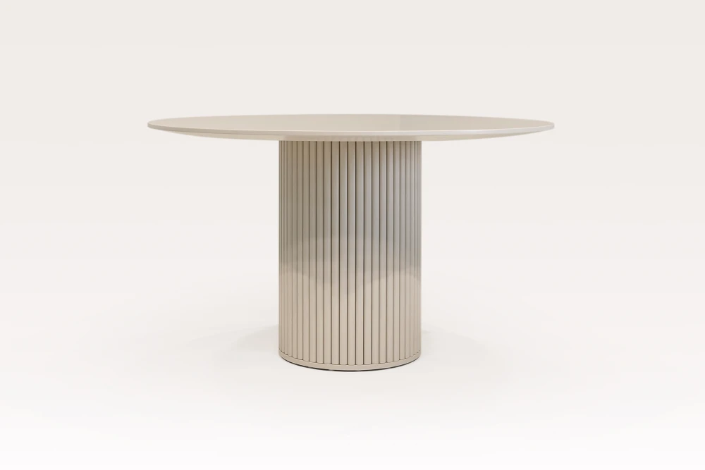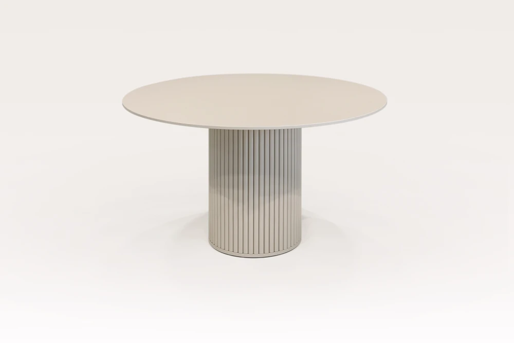 Реечная ножка покрыта эмалью от нежных светлых до насыщенных тёмных оттенков, столешницу можно выполнить в эмали или покрыть элегантным шпоном. Диаметр столешницы — 120 см (или по вашему выбору), подходит для 4–6 человек.