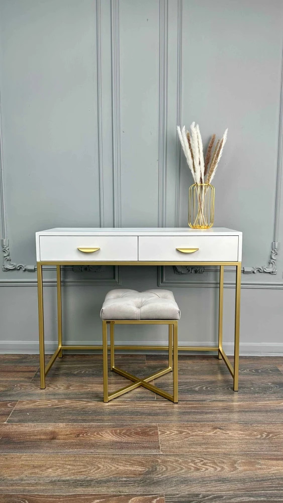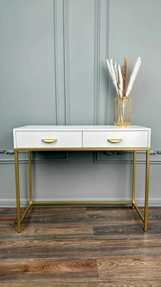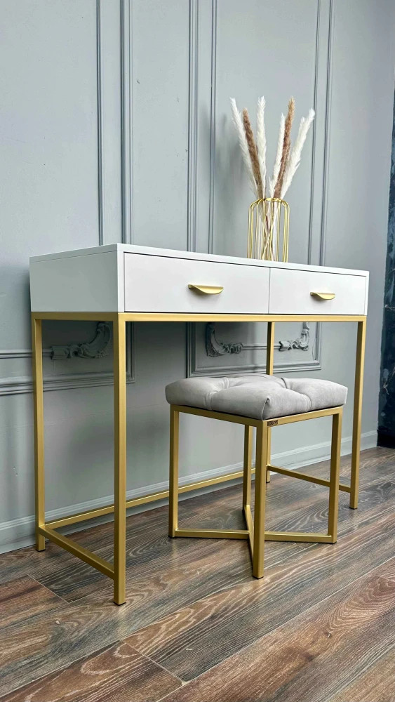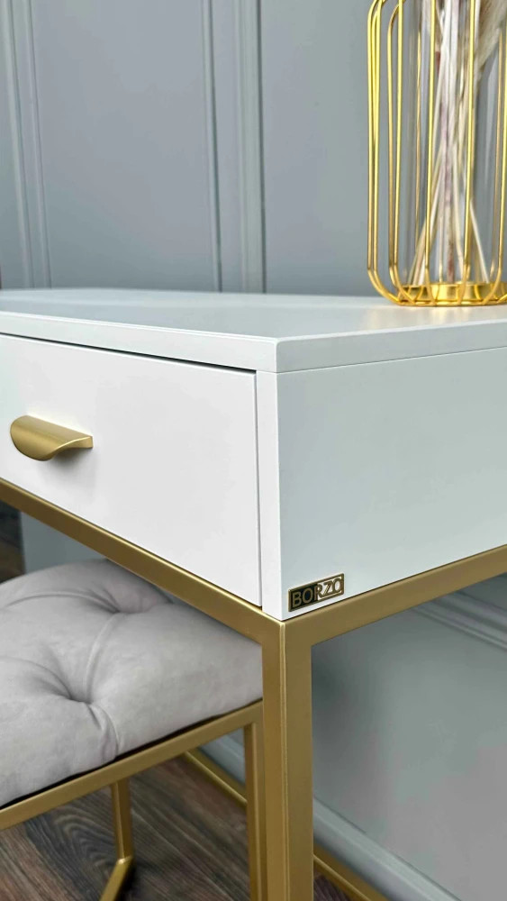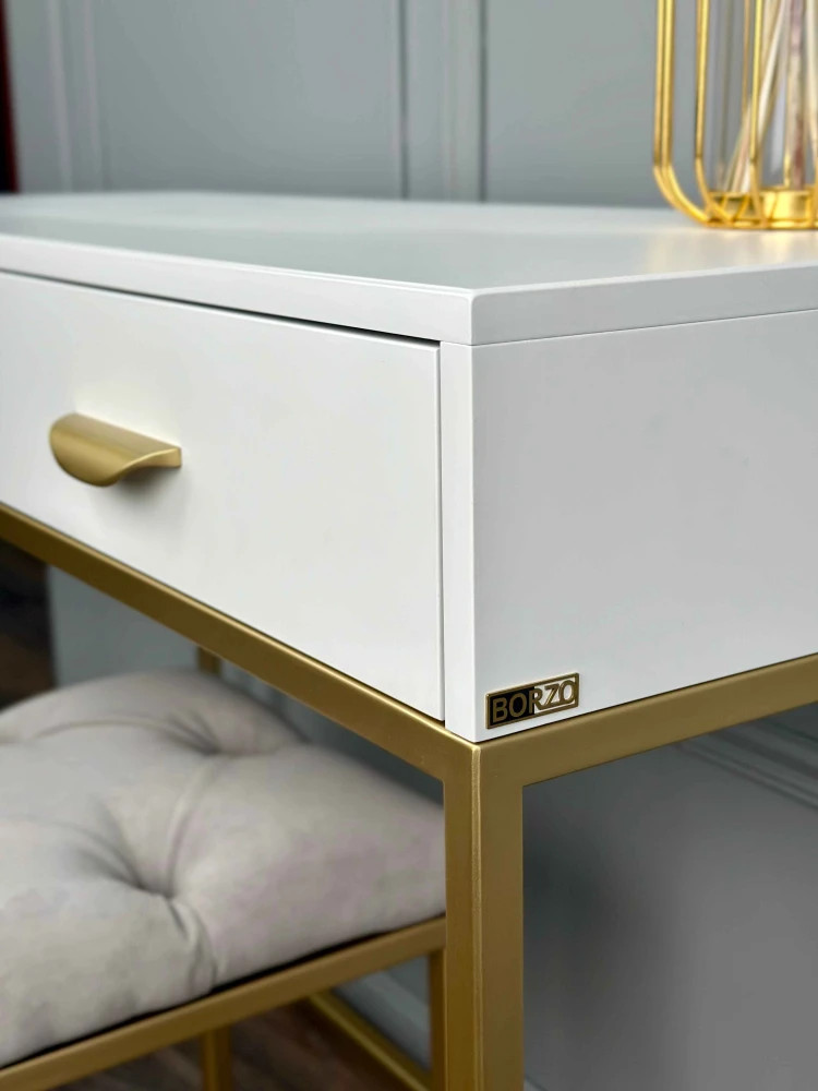 Минималистичный столик с чёткими линиями на чёрном металлическом основании. Прекрасно впишется в современный интерьер — будь то спальня, прихожая или рабочее пространство. Компактный, но функциональный, он придаёт обстановке строгую элегантность.