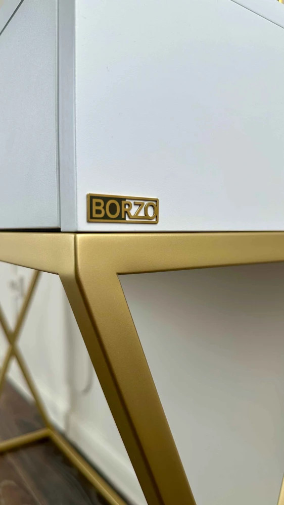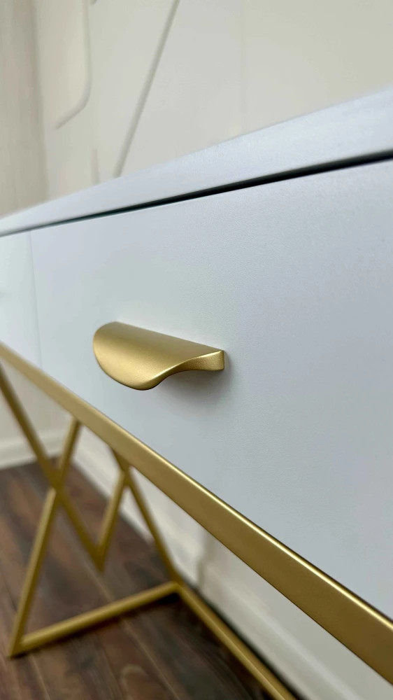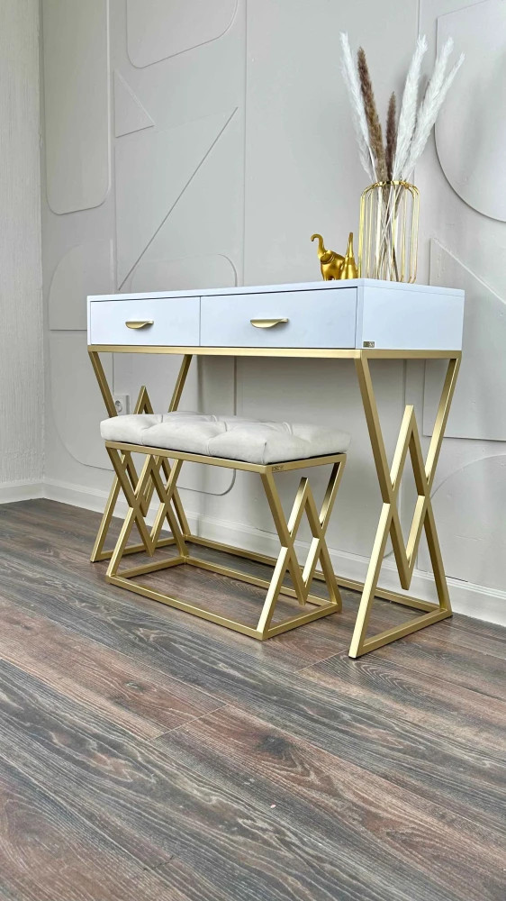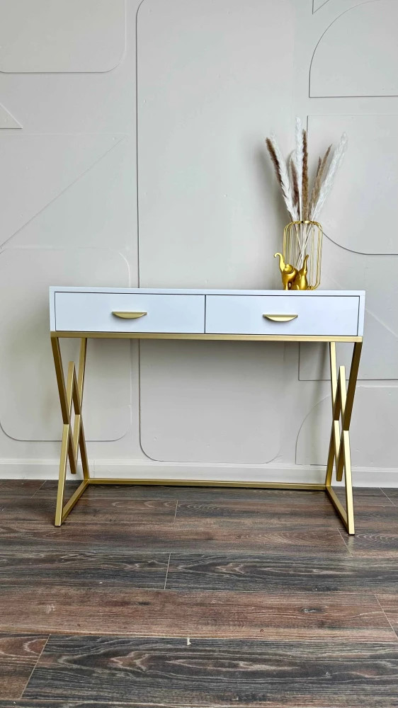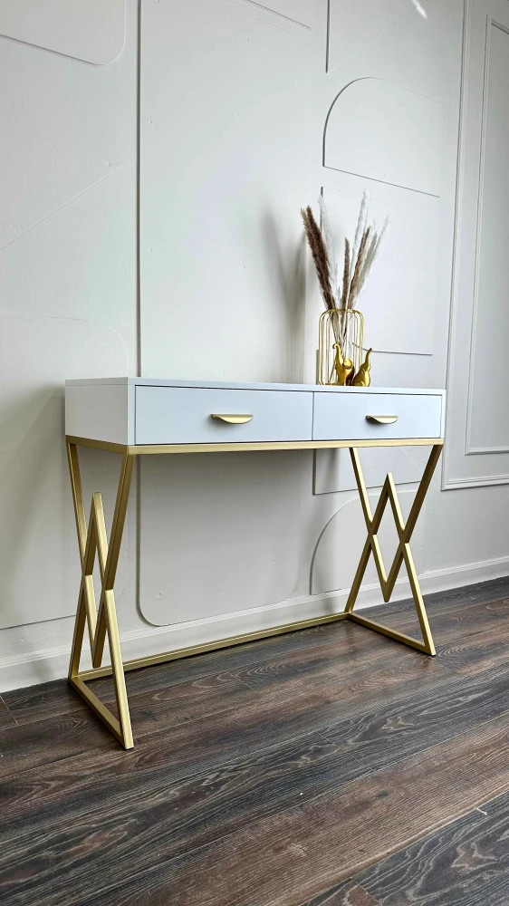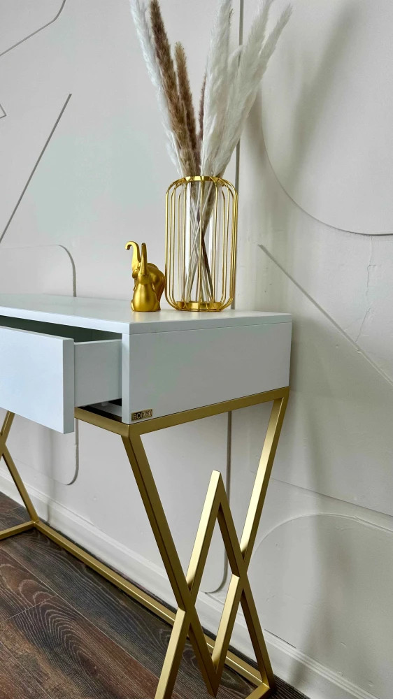Изящный столик на металлическом основании с декоративным боковым рисунком. Отлично подойдёт как для спальни, так и для прихожей или зоны с зеркалом. Белоснежный корпус в сочетании с золотыми деталями придаёт интерьеру лёгкость и элегантность.