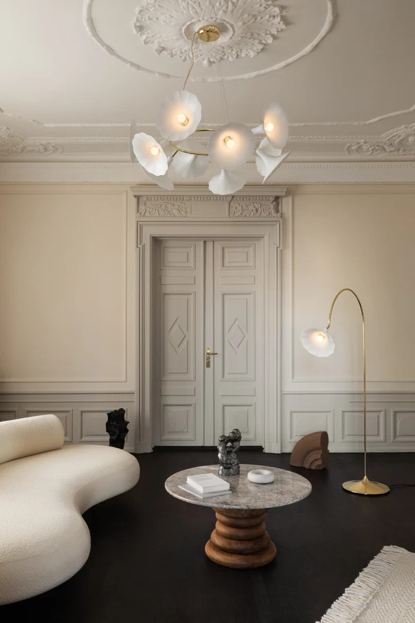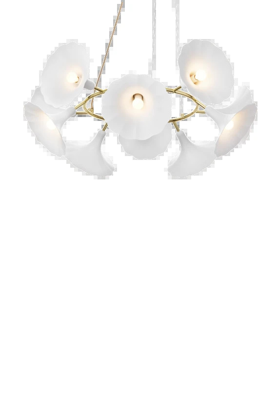 Абажуры из белого металла напоминают распустившийся цветок и украшены деталями из полированной латуни. Источник света расположен в центре цветка, рассеивая мягкий свет.