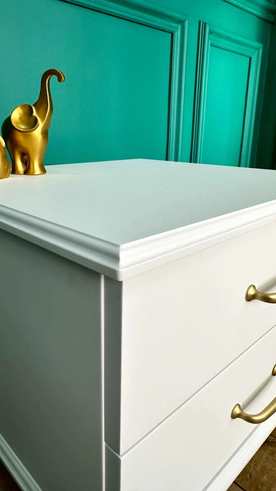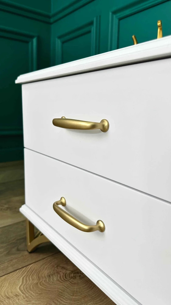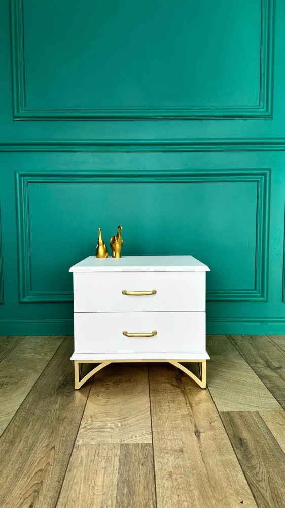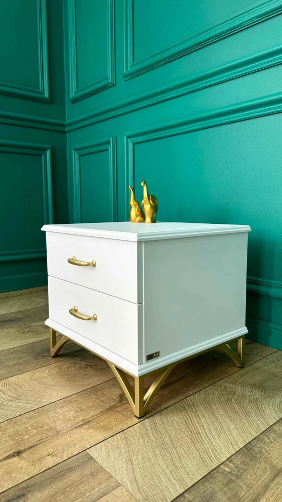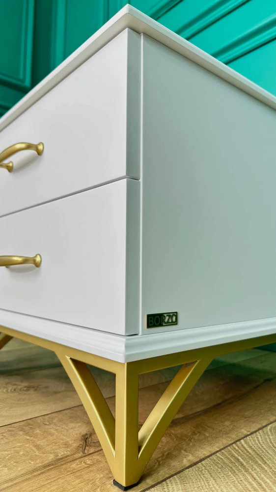Прикроватная тумба с двумя выдвижными ящиками и элегантным металлическим основанием. Отлично подойдёт для хранения мелочей в спальне или гостиной. Фурнитура с доводчиком делает использование особенно удобным.