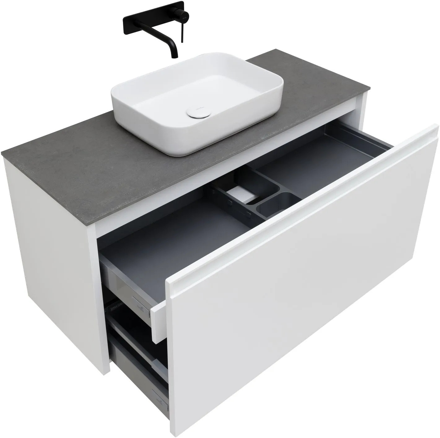 Выдвижные ящики с металлическими боковыми стенками в цвете серый металлик.