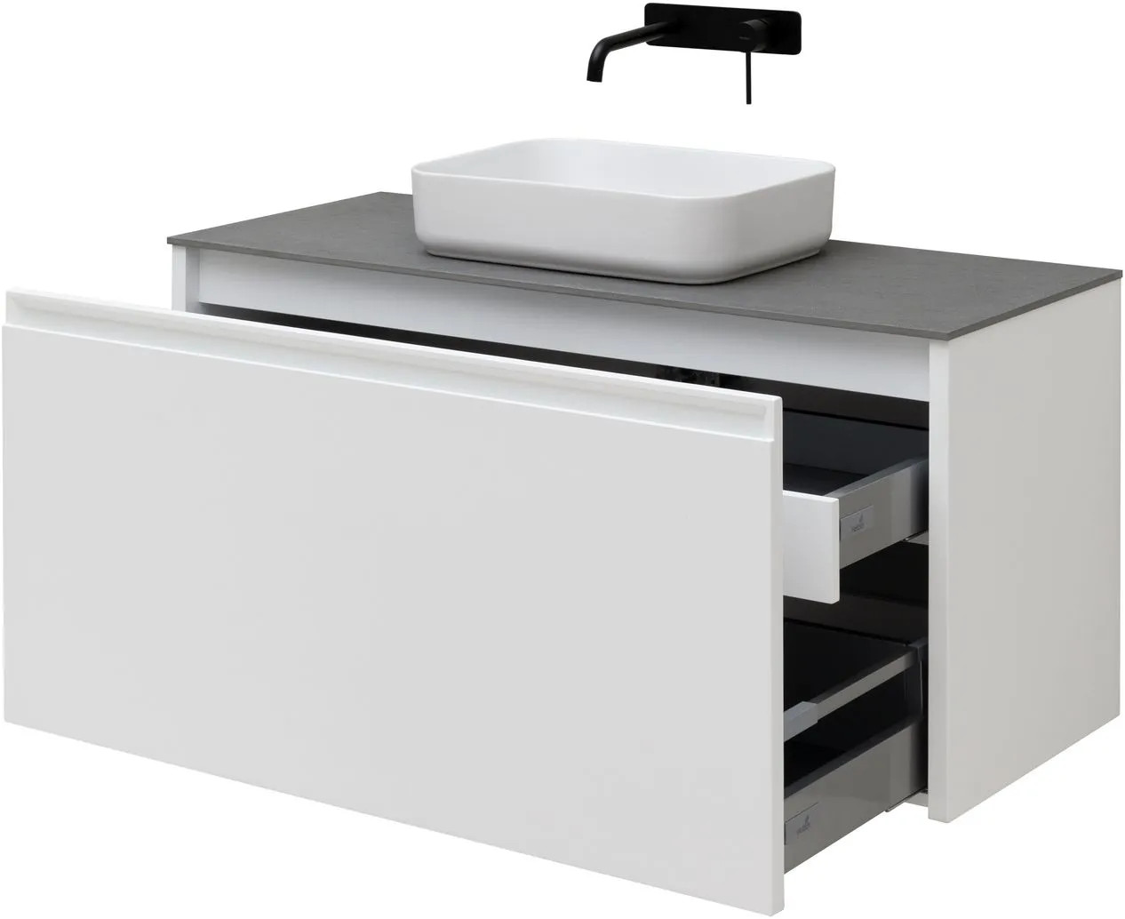 Плавное закрывание ящиков, полное выдвижение, прочное дно (толщина 16 мм), нагрузка до 30 кг.
