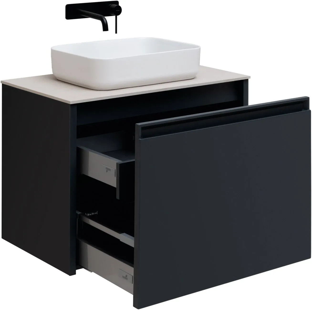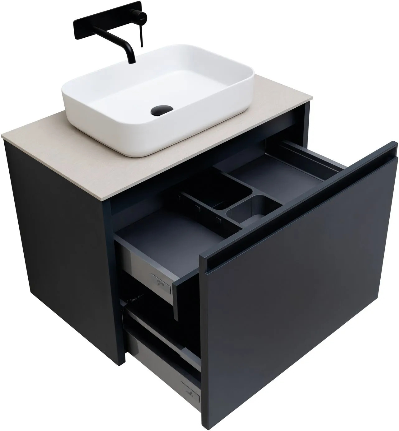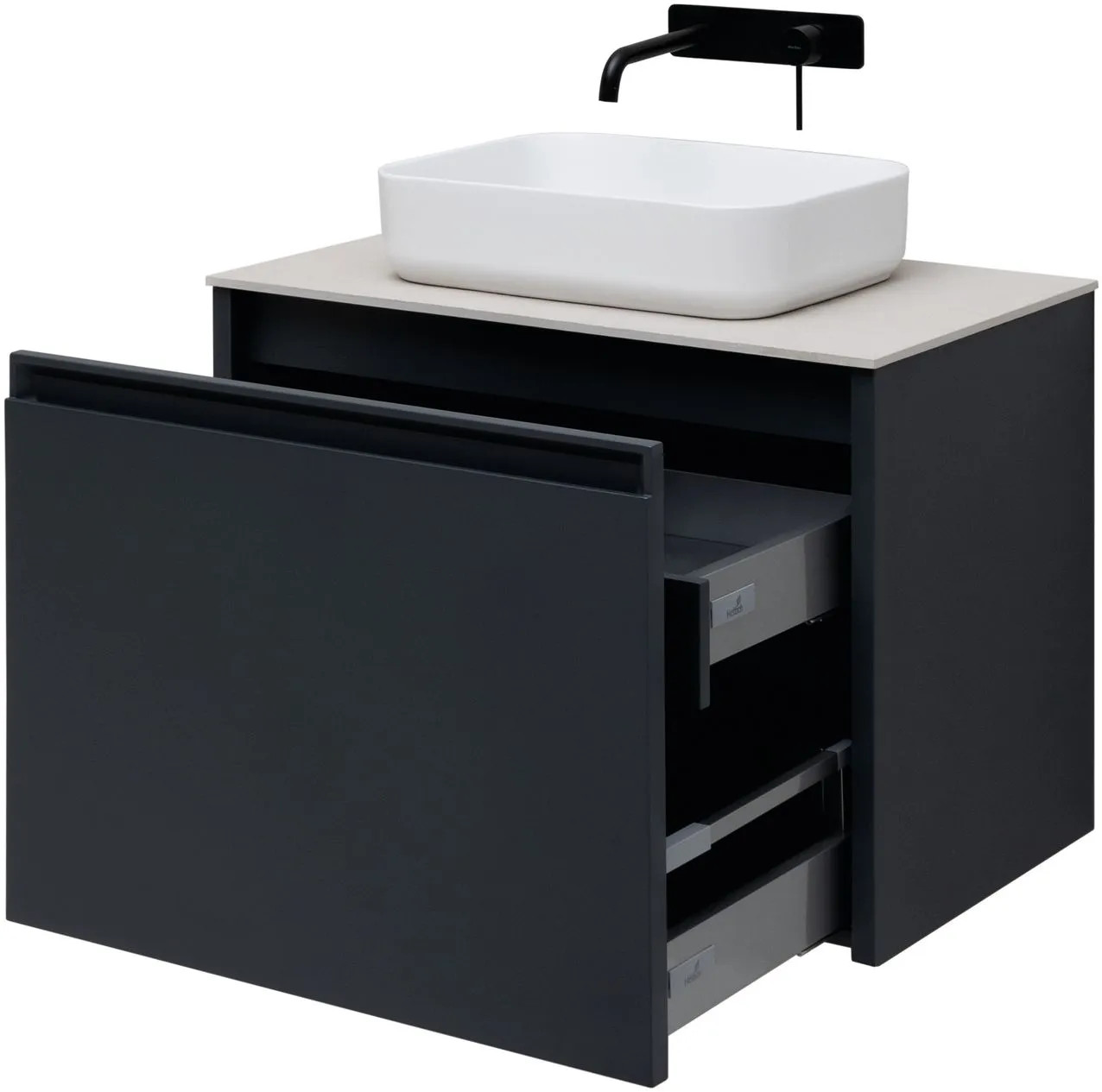 Плавное закрывание ящиков, полное выдвижение, прочное дно (толщина 16 мм), нагрузка до 30 кг.