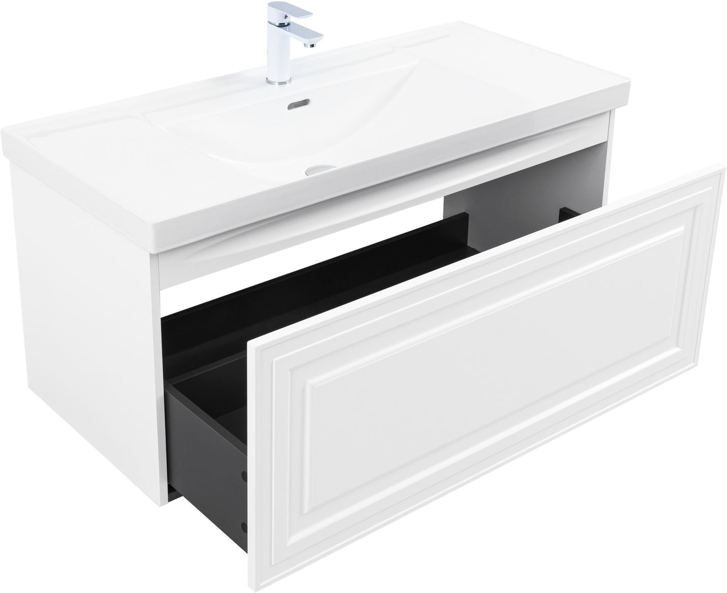 Тумба оснащена вместительным ящиком. Его полезная высота — 380 мм. В дне нет выреза под сифон, что увеличивает полезное пространство. Задняя стенка ящика уменьшена для удобства. Направляющие скрытого монтажа с доводчиками обеспечивают плавное и тихое закрывание.