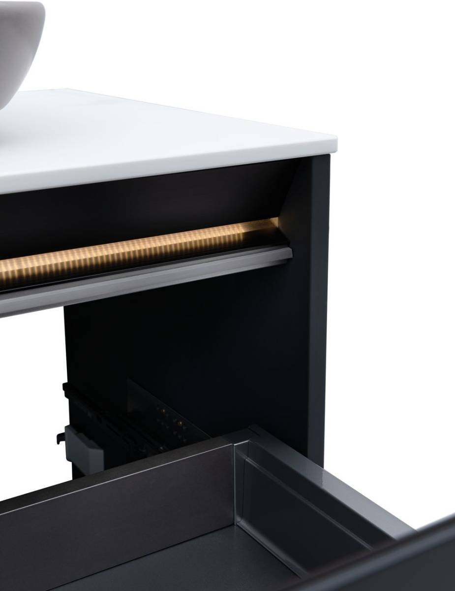 Тумбы и пеналы комплектуются подсветкой в теплом тоне и специальным магнитным датчиком, который позволяет использовать подсветку в 2-х режимах: «декоративная подсветка» - всегда включена и «функциональная подсветка» - включается при открывании ящика или пенала.