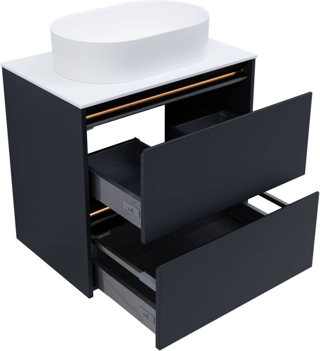 Корпус мебели на верхнем торце фасада имеет металлический декоративный профиль в цвете черный или олива.