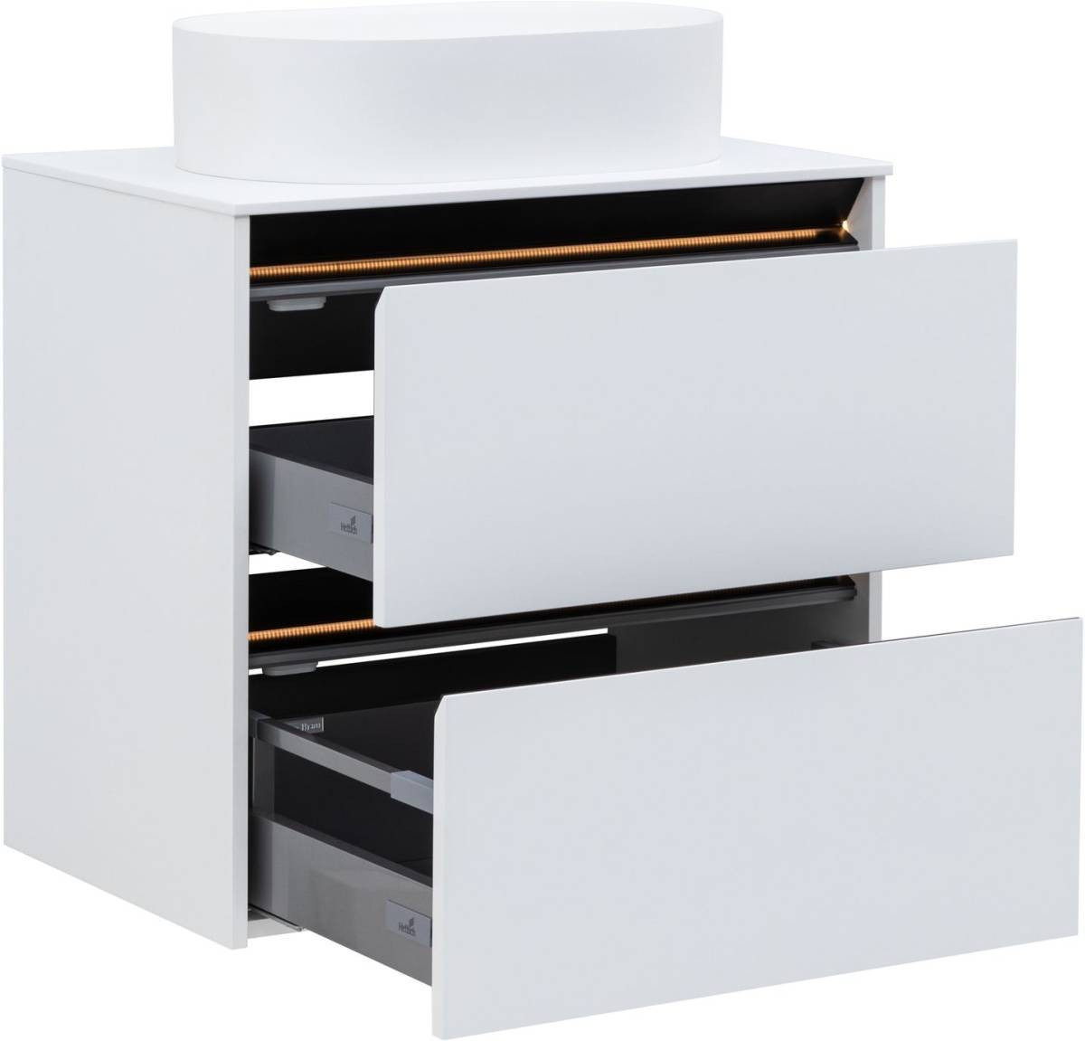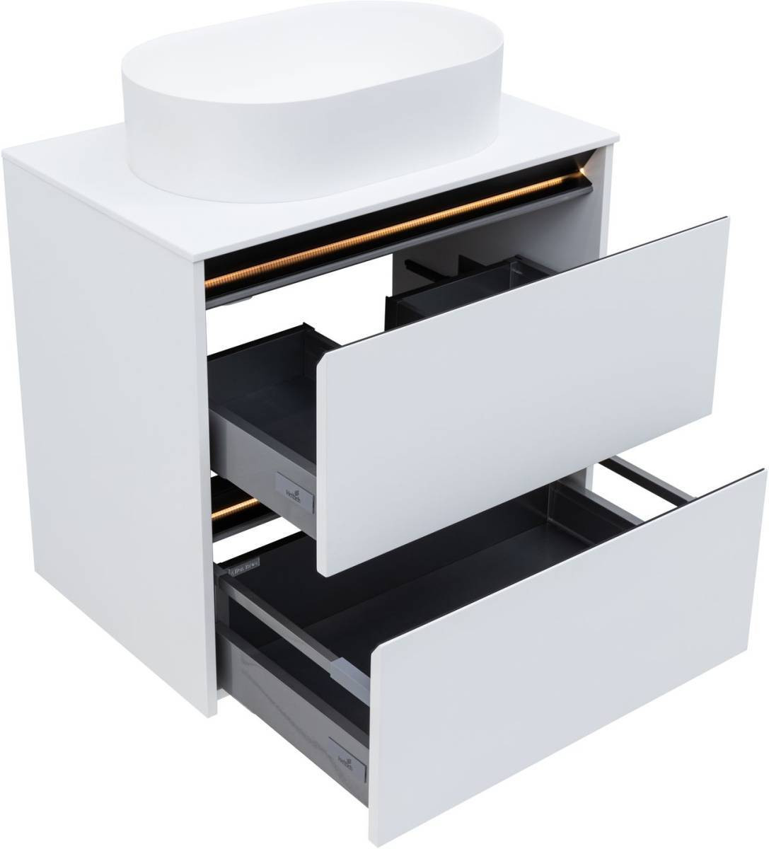 Тумбы и пеналы комплектуются подсветкой в теплом тоне и специальным магнитным датчиком, который позволяет использовать подсветку в 2-х режимах: «декоративная подсветка» - всегда включена и «функциональная подсветка» - включается при открывании ящика или пенала.