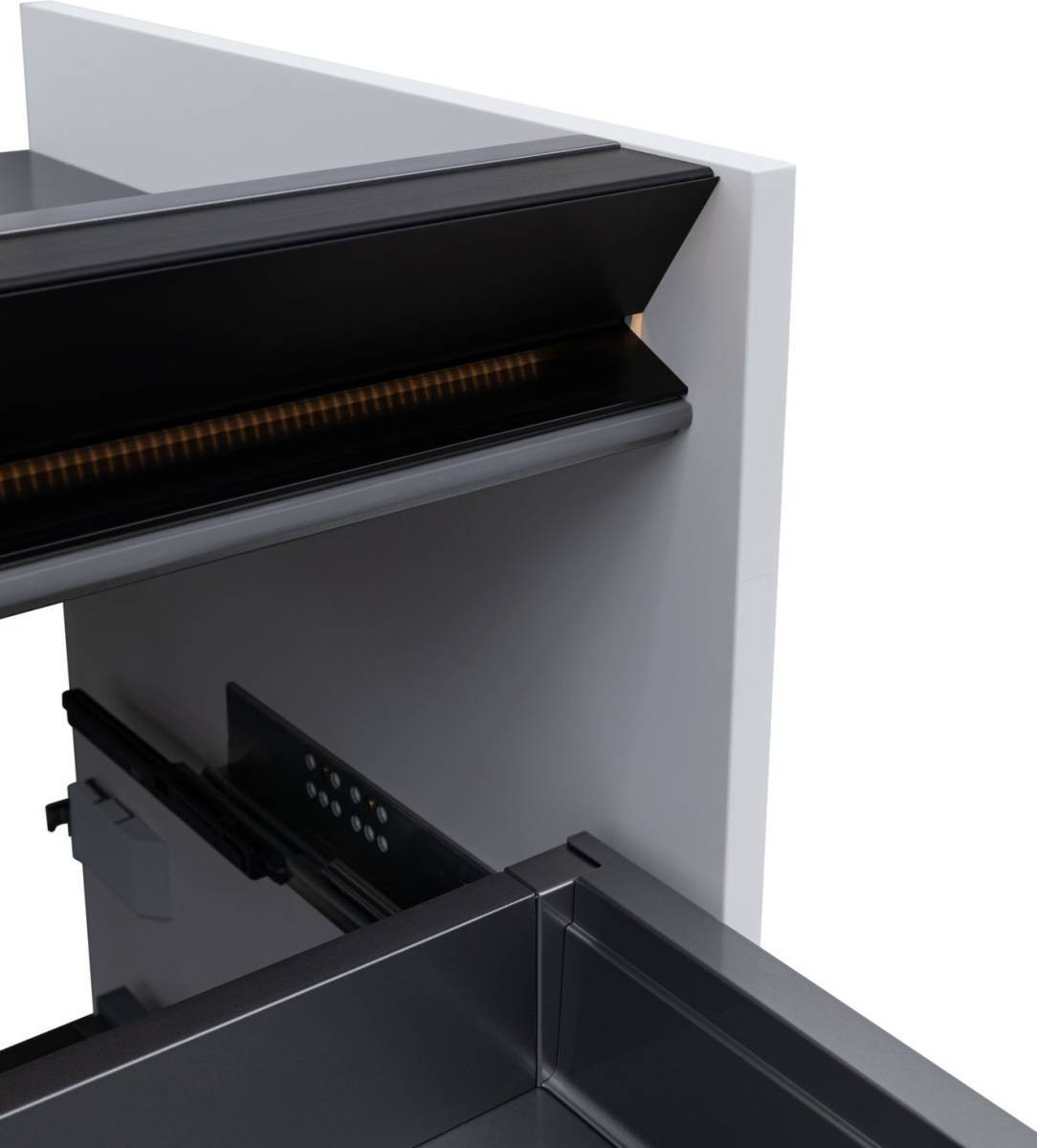 Корпус мебели на верхнем торце фасада имеет металлический декоративный профиль в цвете черный или олива.