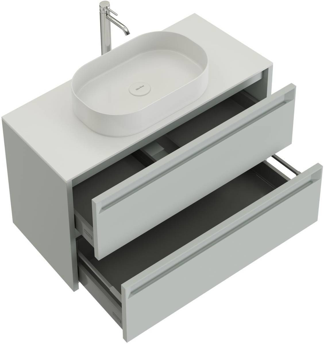 Выдвижные ящики с металлическими боковыми стенками в цвете серый металлик.