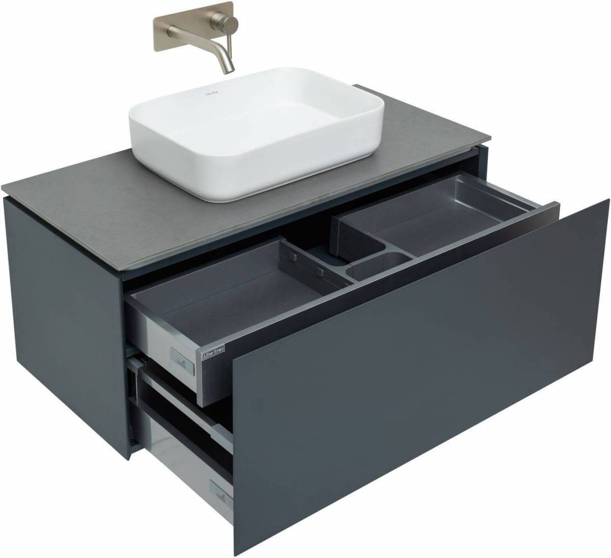 Выдвижные ящики с металлическими боковыми стенками в цвете серый металлик.