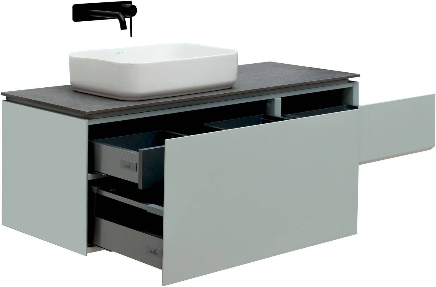 Выдвижные ящики с металлическими боковыми стенками в цвете серый металлик.
