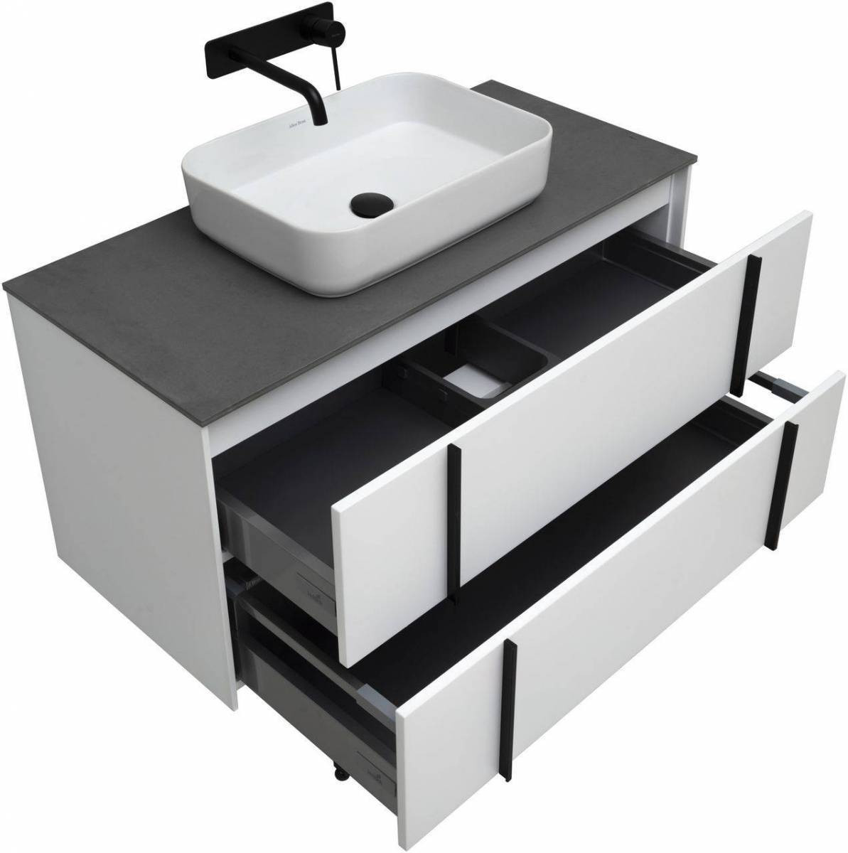 Тумбы оснащены специальной пластиковой рамой, которая надежно защищает вырез под сифон, служит органайзером и позволяет закрепить дополнительный набор контейнеров для хранения.