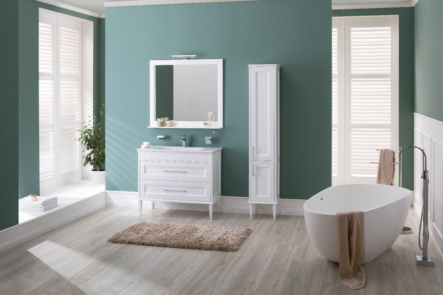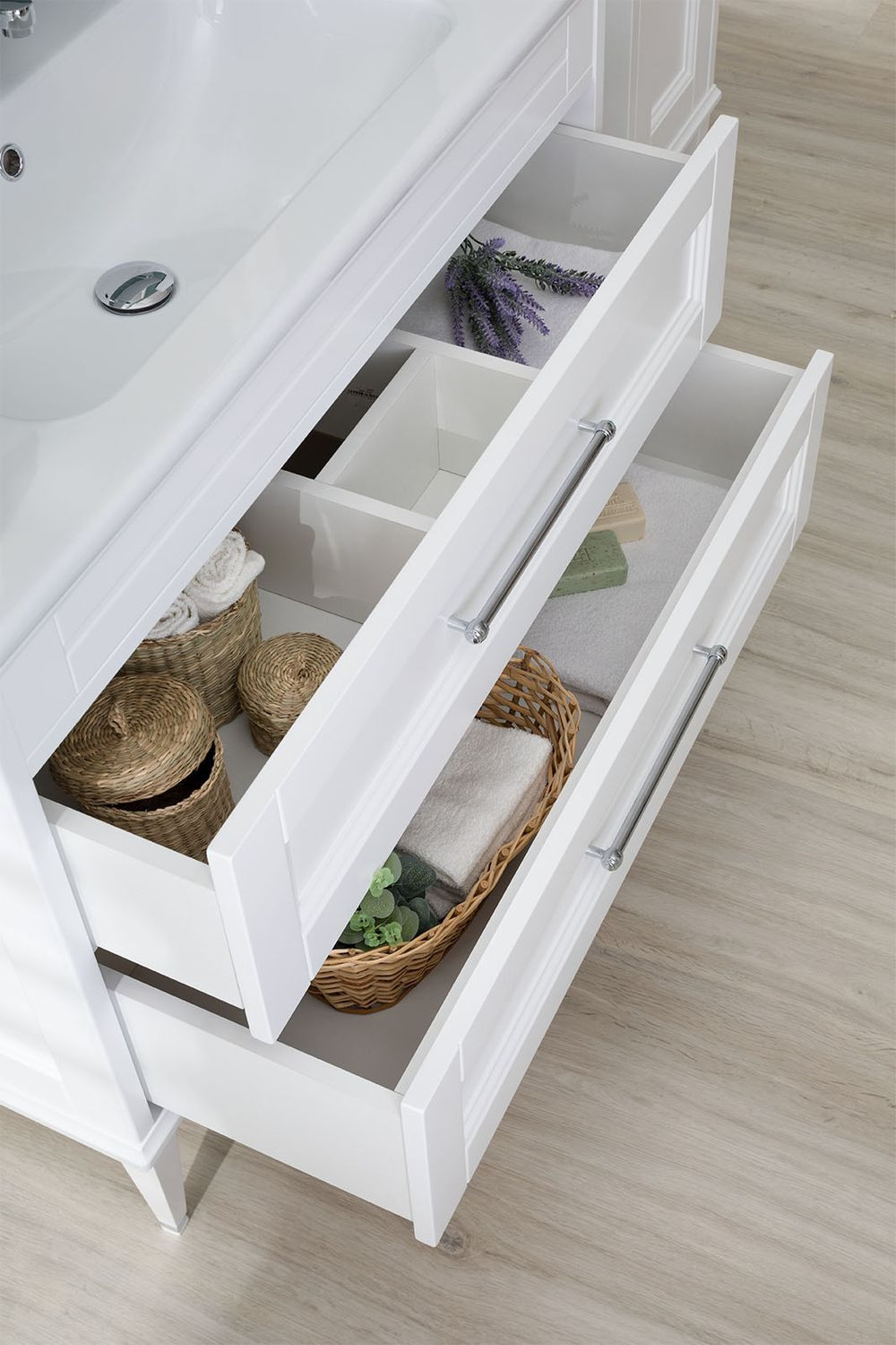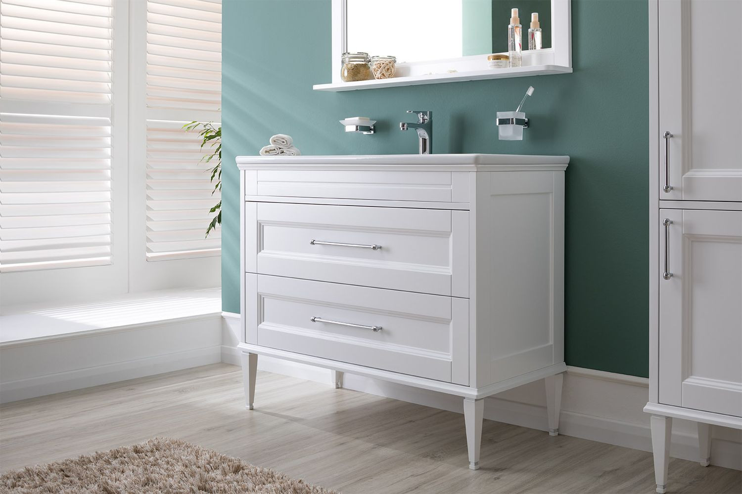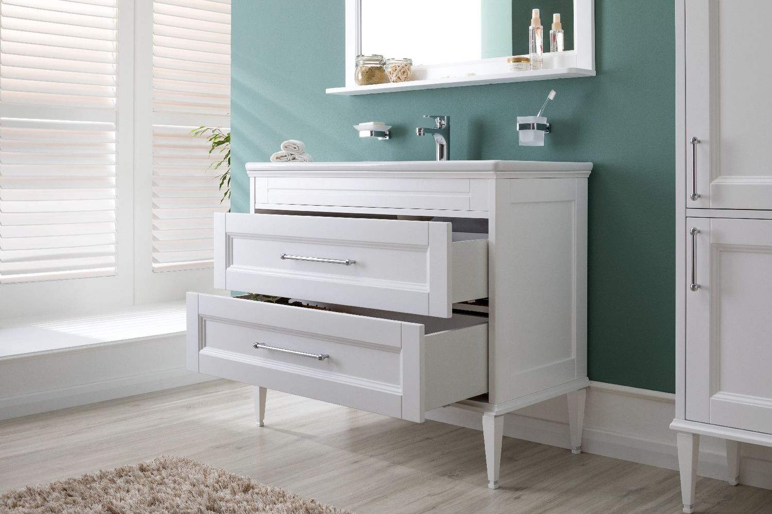 Тумба Aquanet Бостон М 100 белого цвета интересна внешне. Фрезеровка по белоснежным матовым фасадам и по боковым ее частям придает внешнему виду изделия шириной 100 см достойный и благородный вид, свойственный классике. Но утонченные ручки производства известной турецкой фирмы System, словно ниточки поблескивающие на фасадах, визуальная легкость изделия напоминает о модерне. Тумба с двумя выдвижными ящиками, оборудованными доводчиками производства компании Hettich, вмещает огромное количество полезных вещей. В верхнем ящике предусмотрено три отделения, что делает его пространство более удобным для использования: все вещи будут на своих местах. Нижний ящик просторный и в него можно поставить многочисленные шампуни, гели, муссы, маски, кремы и другие емкости. Тумба комплектуется качественной керамической раковиной «Эйфория», изготовленной по чешской шамотной технологии компанией Dreja. Модель имеет два варианта монтажа. Базовый – подвесной. Кроме того, специально для этой коллекции были разработаны очень элегантные ножки, выполненные из массива и окрашенные в белый цвет. С такими ножками тумба приобретает благородный вид и еще больше тяготеет по своему стилю к классике.