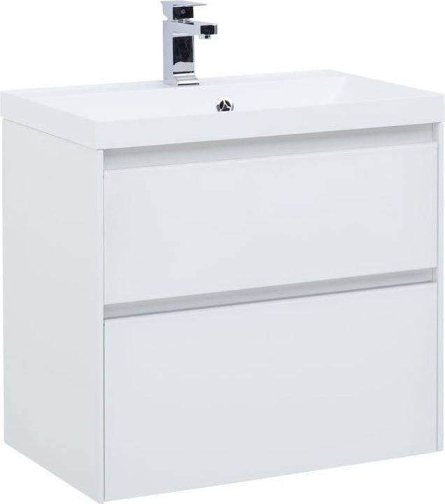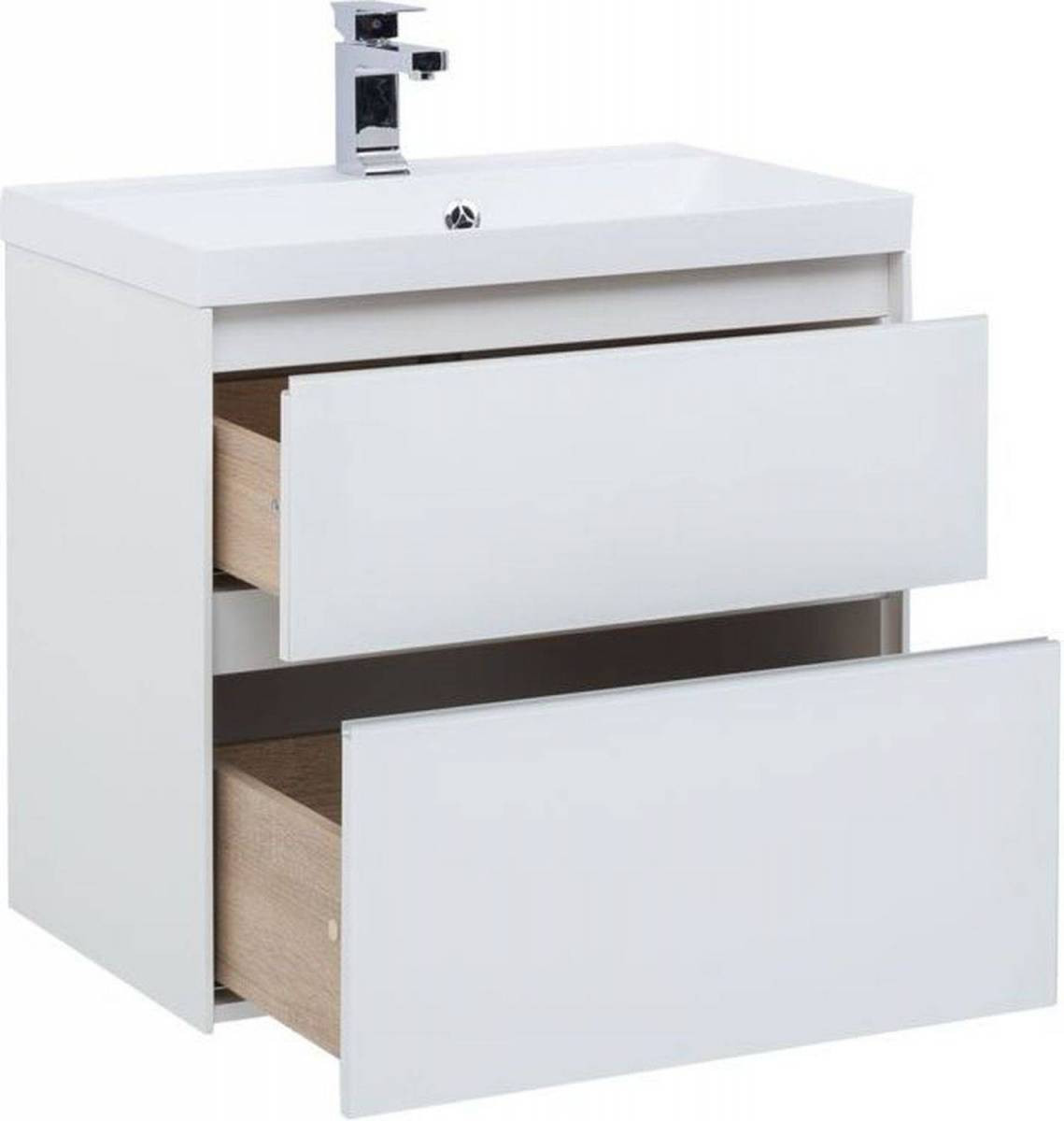 Тумба под раковину Aquanet Гласс 60 белого цвета смотрится эффектно благодаря сочетанию белого матового стекла на фасаде верхнего выдвижного ящика с белоснежными глянцевыми поверхностями корпуса, выполненного из МДФ. Такое покрытие, к тому же, надежно защищает мебель от воздействия воды. «Изюминку» во внешний вид вносит внутренняя часть выдвижных ящиков, выполненная в цвете «дуб сонома». Древесная фактура вносит свежесть и живописность в дизайн всего изделия.