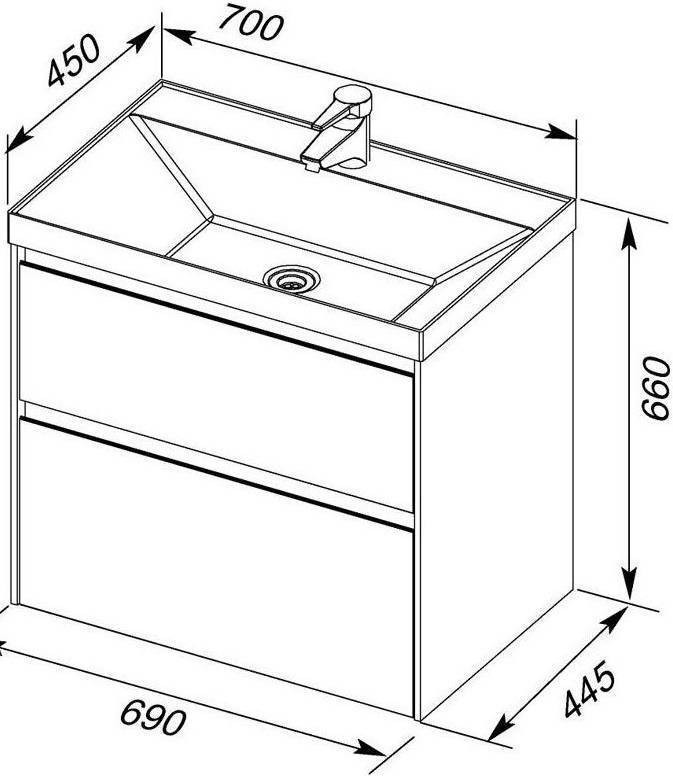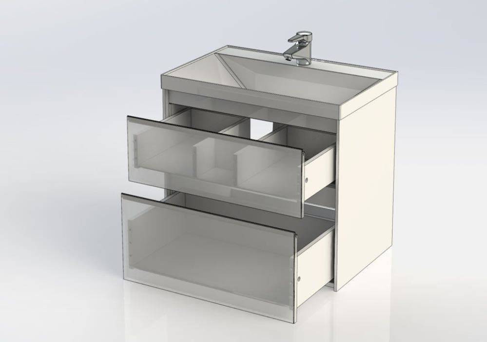 Производители позаботились о деталях. Ящики лишены выступающих деталей, ручки интегрированы в фасад. Тумбу шириной 70 см можно из подвесного элемента преобразовать в напольный, просто докупив универсальные ножки. Ящики тумб оснащены направляющими Hettich Quadro c плавным закрыванием, более известным нам как доводчик. Комплект тумбе составит раковина из литьевого мрамора «Орлеан», относящаяся к числу накладных моделей, которая внешне выглядит как единое целое с тумбой.
