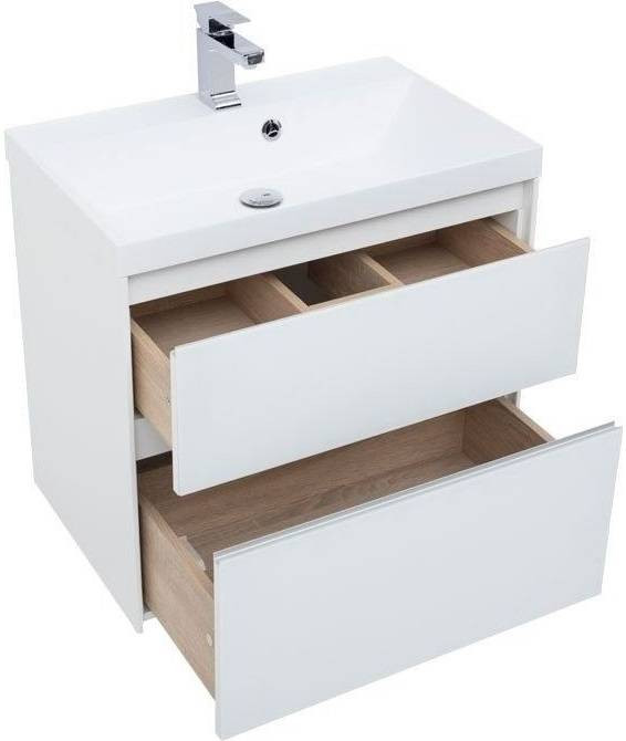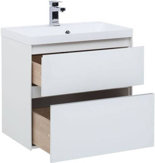 Тумба под раковину Aquanet Гласс 70 белого цвета смотрится эффектно благодаря сочетанию белого матового стекла на фасаде верхнего выдвижного ящика с белоснежными глянцевыми поверхностями корпуса, выполненного из МДФ. Такое покрытие, к тому же, надежно защищает мебель от воздействия воды. «Изюминку» во внешний вид вносит внутренняя часть выдвижных ящиков, выполненная в цвете «дуб сонома». Древесная фактура вносит свежесть и живописность в дизайн всего изделия.