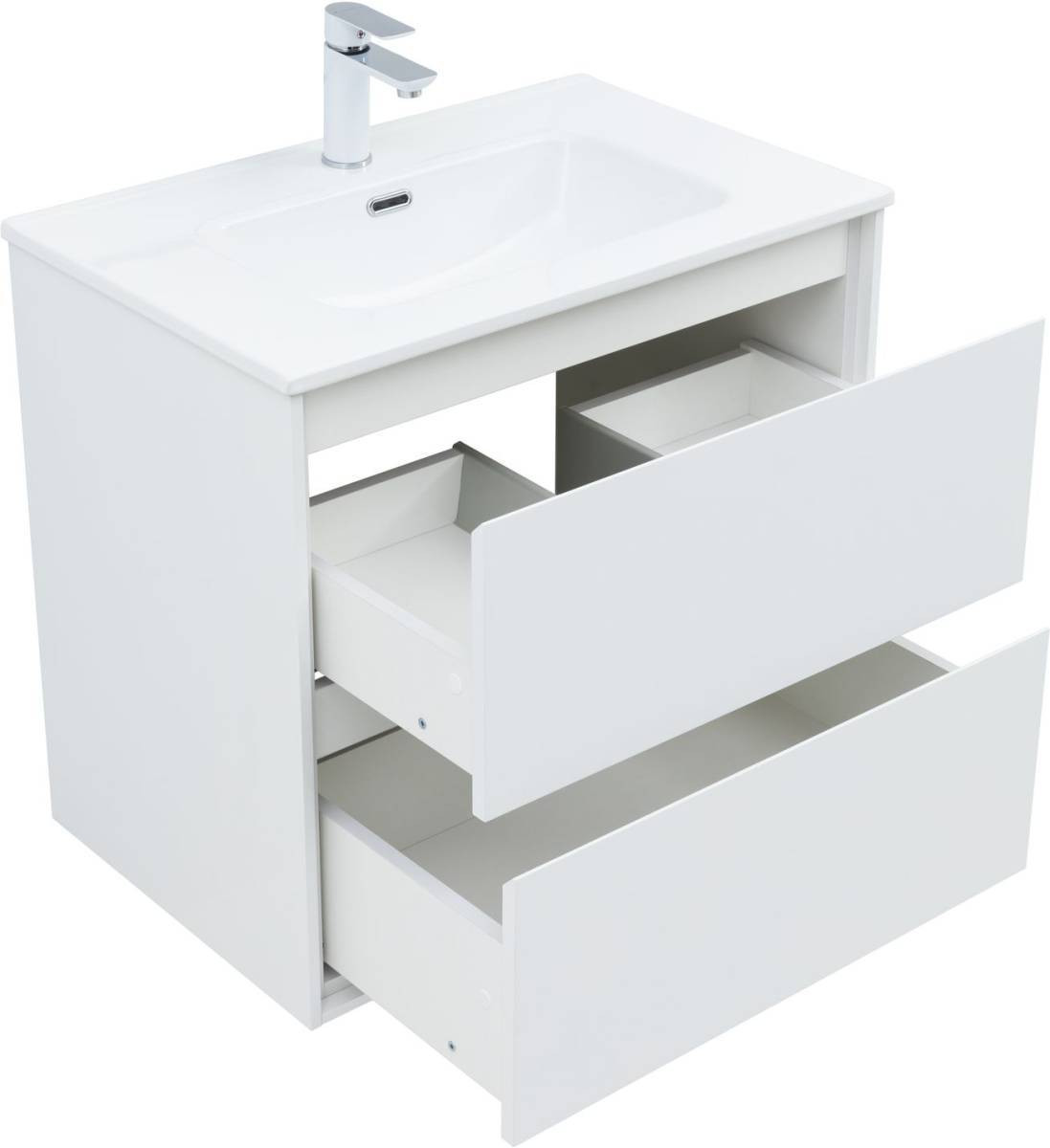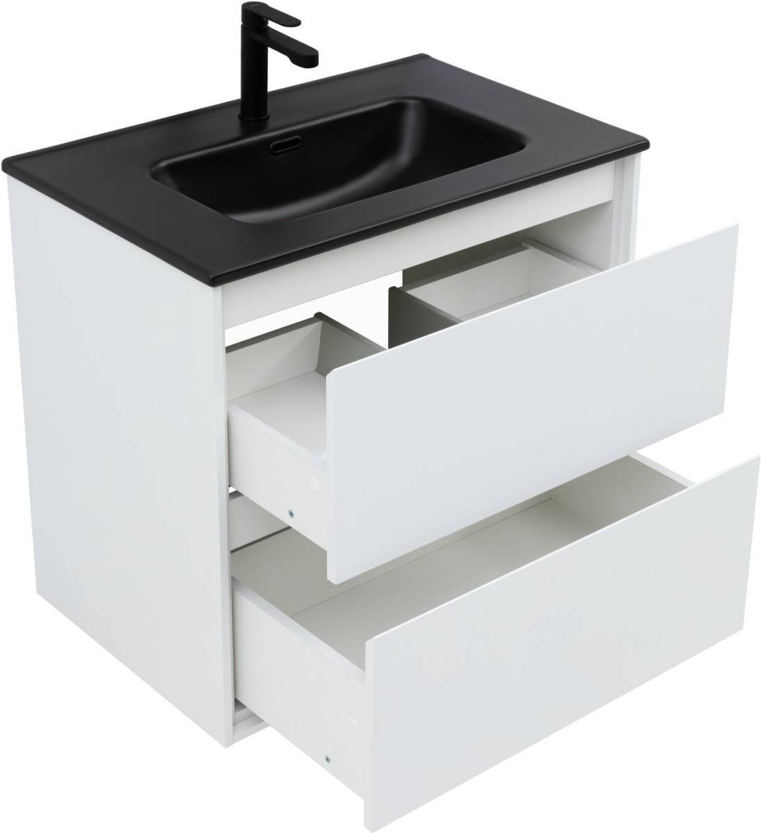Кроме того, надёжные навесы, способные выдерживать нагрузки до 130 кг, обеспечивают уверенную поддержку раковины и всего оборудования. Внутреннее пространство тумбы организовано с умом: выдвижные ящики из ВЛДСП имеют прочное дно и направляющие частичного выдвижения, что делает их идеальными для хранения туалетных принадлежностей. Специальная пластиковая вставка под сифон в сером цвете завершает функционал тумбы, сохраняя при этом чистоту и порядок в ванной комнате.