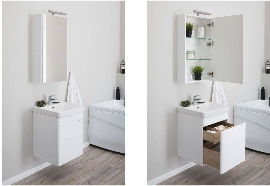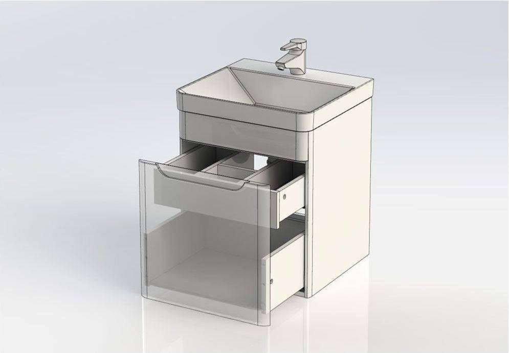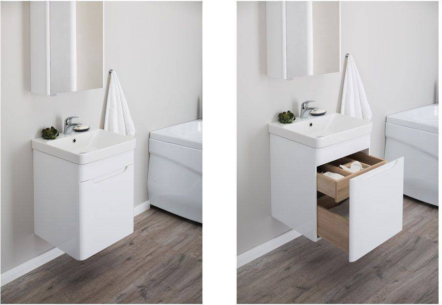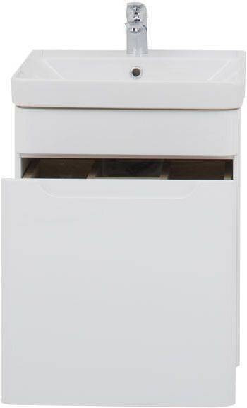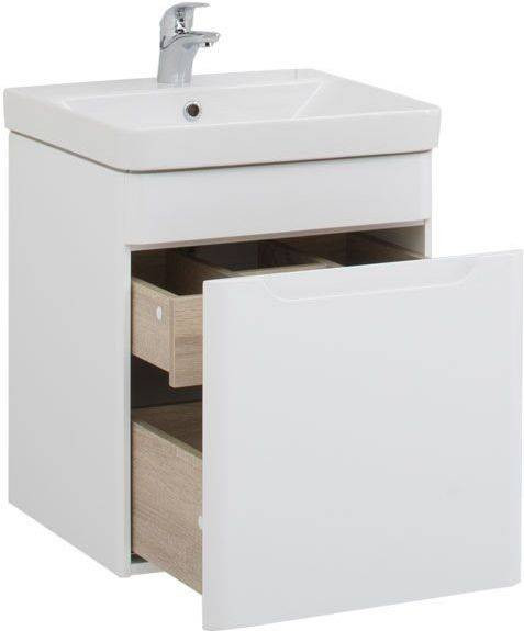 Тумба под раковину Aquanet София 50 белого цвета относится к числу изделий, где все детали продуманы до мелочей. Простая форма прямоугольника - в основе подвесной тумбы, элегантно закругленные углы - для эстетичности и в целях безопасности, керамическая раковина, составляющая внешне единое целое с тумбой, многокомпонентная зона хранения, которая, несомненно, порадует рачительных хозяев. Для исполнения корпуса изделия использован влагостойкий ЛДСП, выкрашенный белой краской, фасады - из МДФ, внутренние ящики - ВЛДСП в цвете дуб сонома. Глянцевые поверхности выглядят безупречно. Конструкция внутреннего устройства тумбы шириной 50 см представляет собой большой выдвижной ящик, внутри которого предусмотрен еще один, небольшой, с тремя отделениями для размещения различных мелочей. Интегрированная ручка удобна в использовании, при этом выглядит элегантно и лаконично.