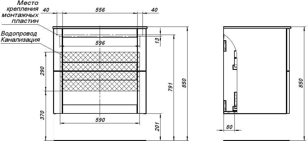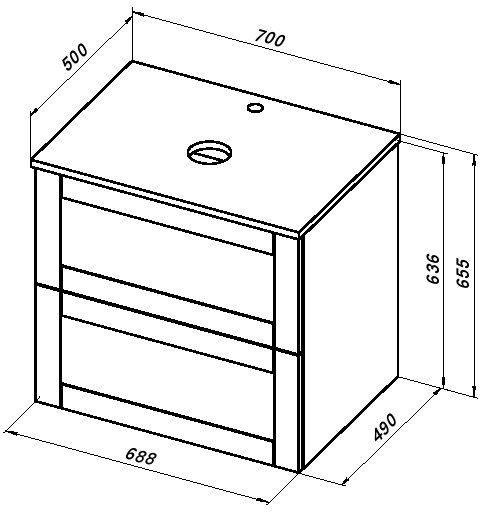 В столешнице Терра предусмотрены 2 отверстия: под слив раковины и под смеситель с установкой на столешницу. Расположение смесителя - за чашей раковины, по центру.