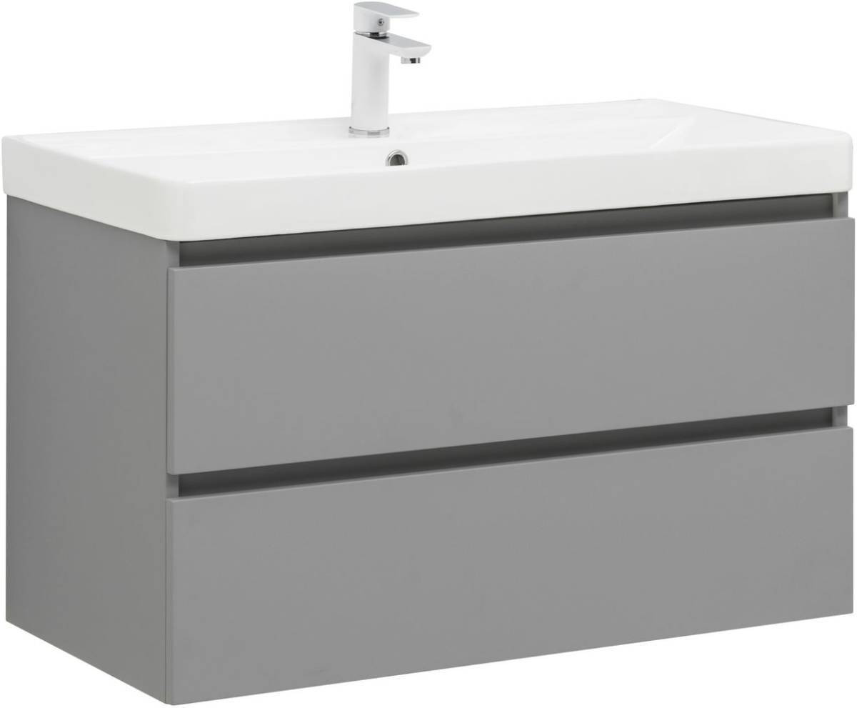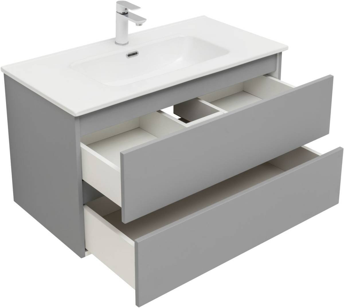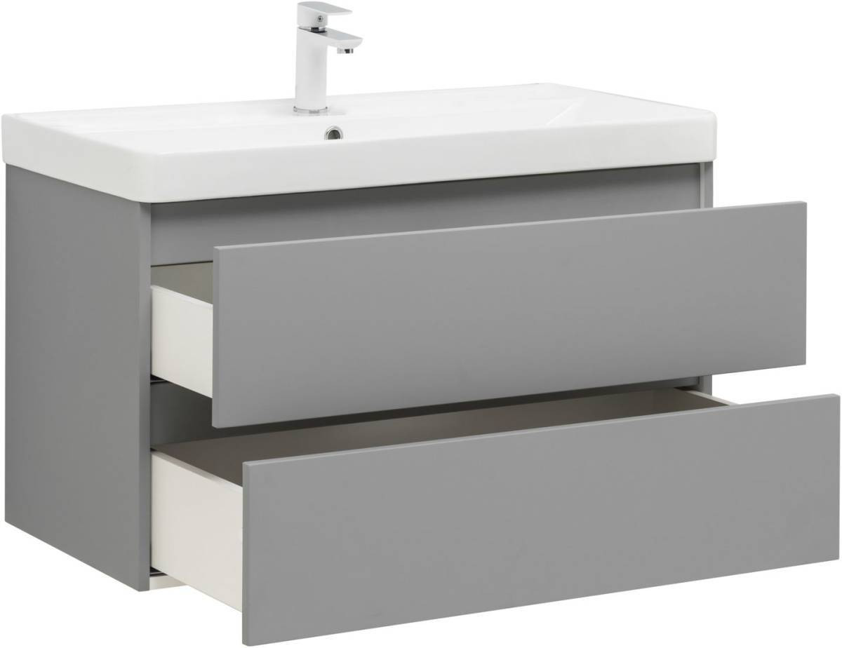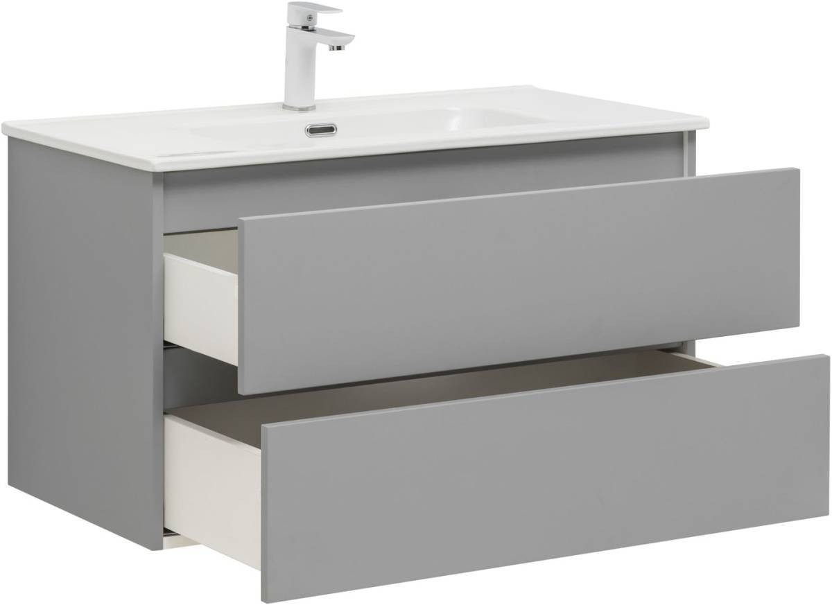 Фасады и корпуса из суперматовой пленки ПВХ обладают повышенной прочностью и эффектом «Soft touch», обеспечивая не только прекрасный внешний вид, но и приятные тактильные ощущения. Тумба оснащена двумя ящиками с механизмом доводчика, что обеспечивает плавное и бесшумное закрытие, а также высокую функциональность.