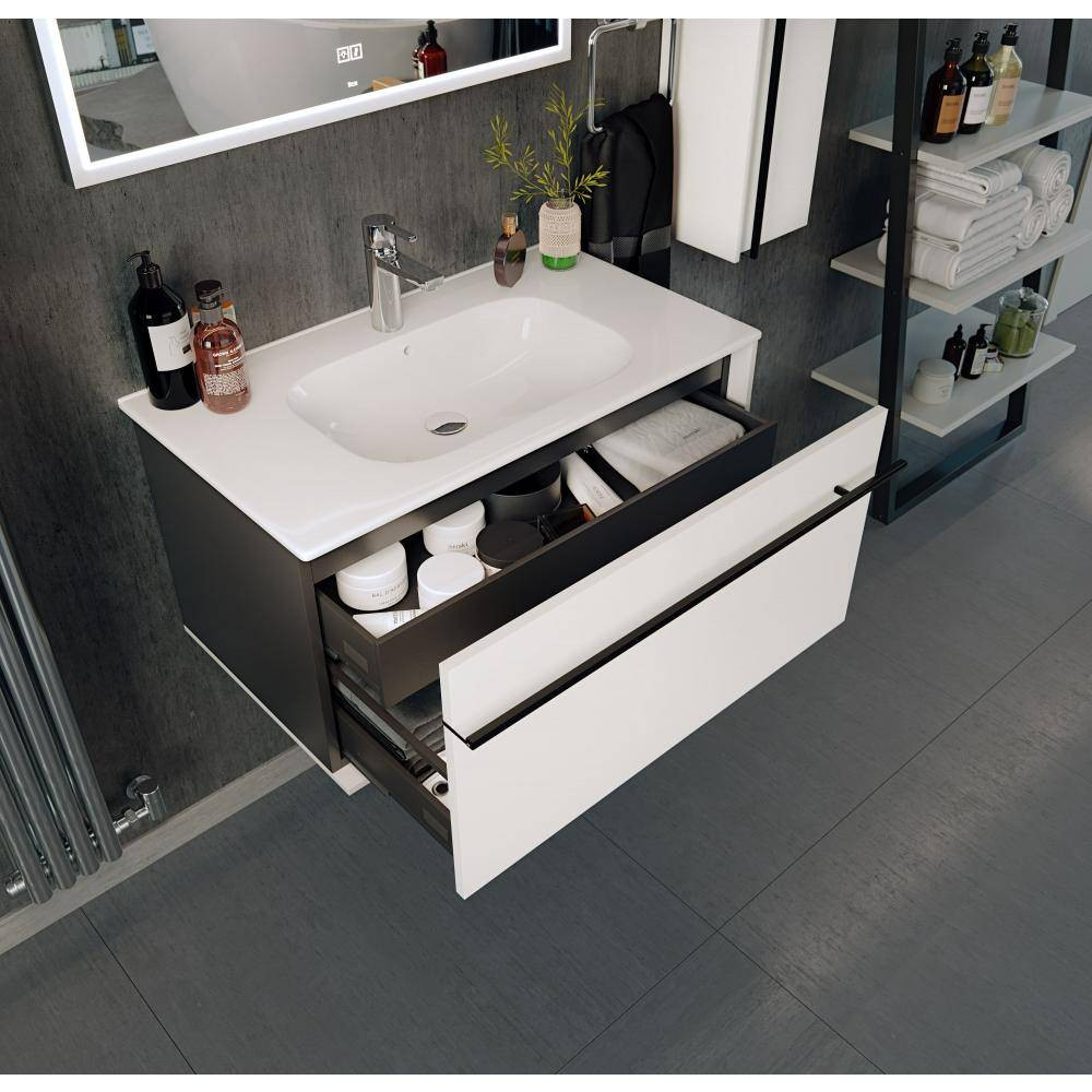 Четкая геометрия линий, сдержанность и широкий функционал три определения, которые лучше всего описывают коллекцию Aneto. Фасад модуля Aneto размера 800 мм выполнен из MDF, окрашенной в белоснежный глянец, а корпус и левая боковая стенка из влагостойкой ламинированной плиты в черном цвете. За фасадом находится небольшой внутренний ящик, открывающийся с помощью системы push-to-open и идеально подходящий для хранения небольших мелочей. Вместительный внешний ящик позволит разместить более крупные предметы. Тонкая и изящная ручка в черном матовом цвете подчеркивает графичность дизайна коллекции и может использоваться как полотенцедержатель. Модуль комплектуется керамической раковиной Roca Victoria-N.