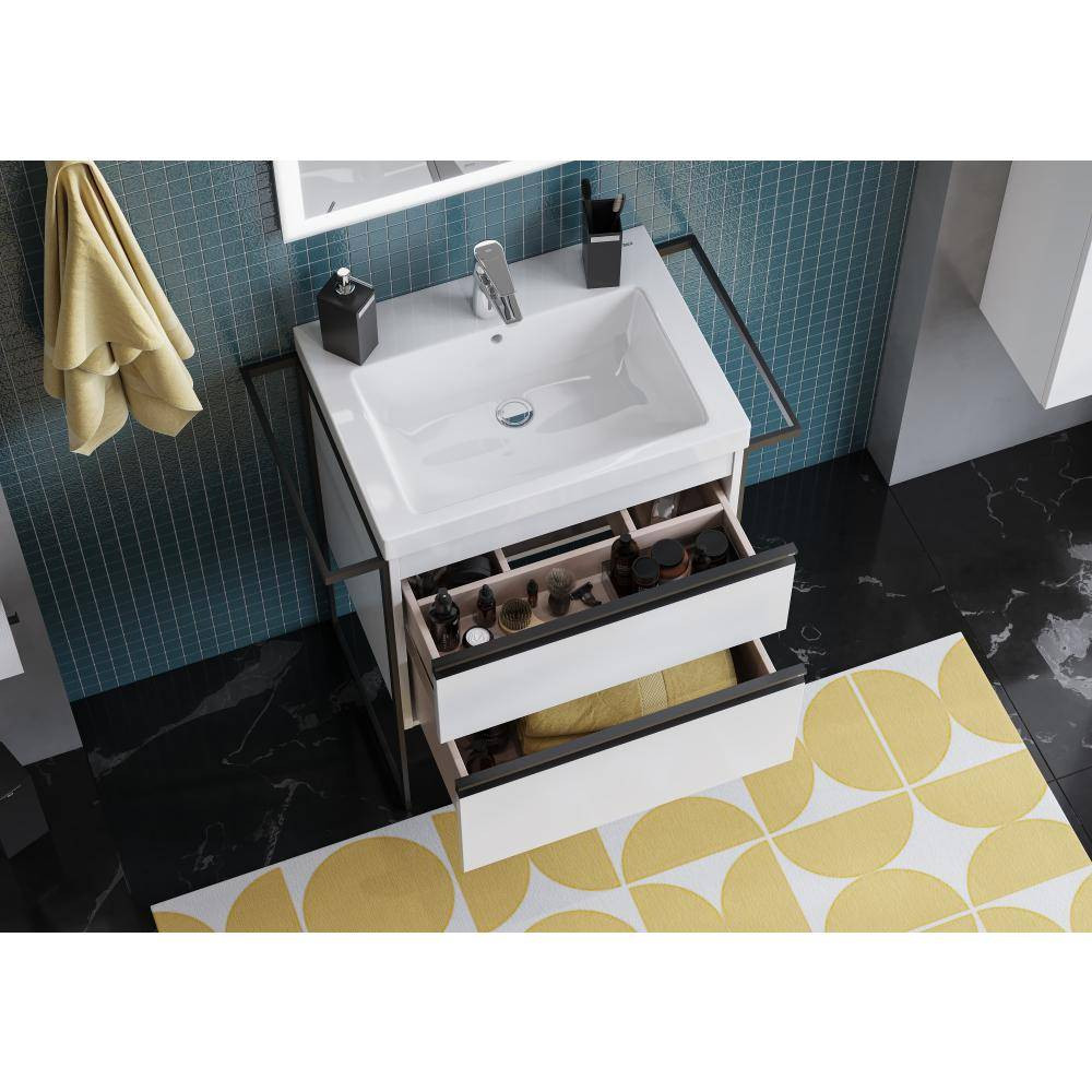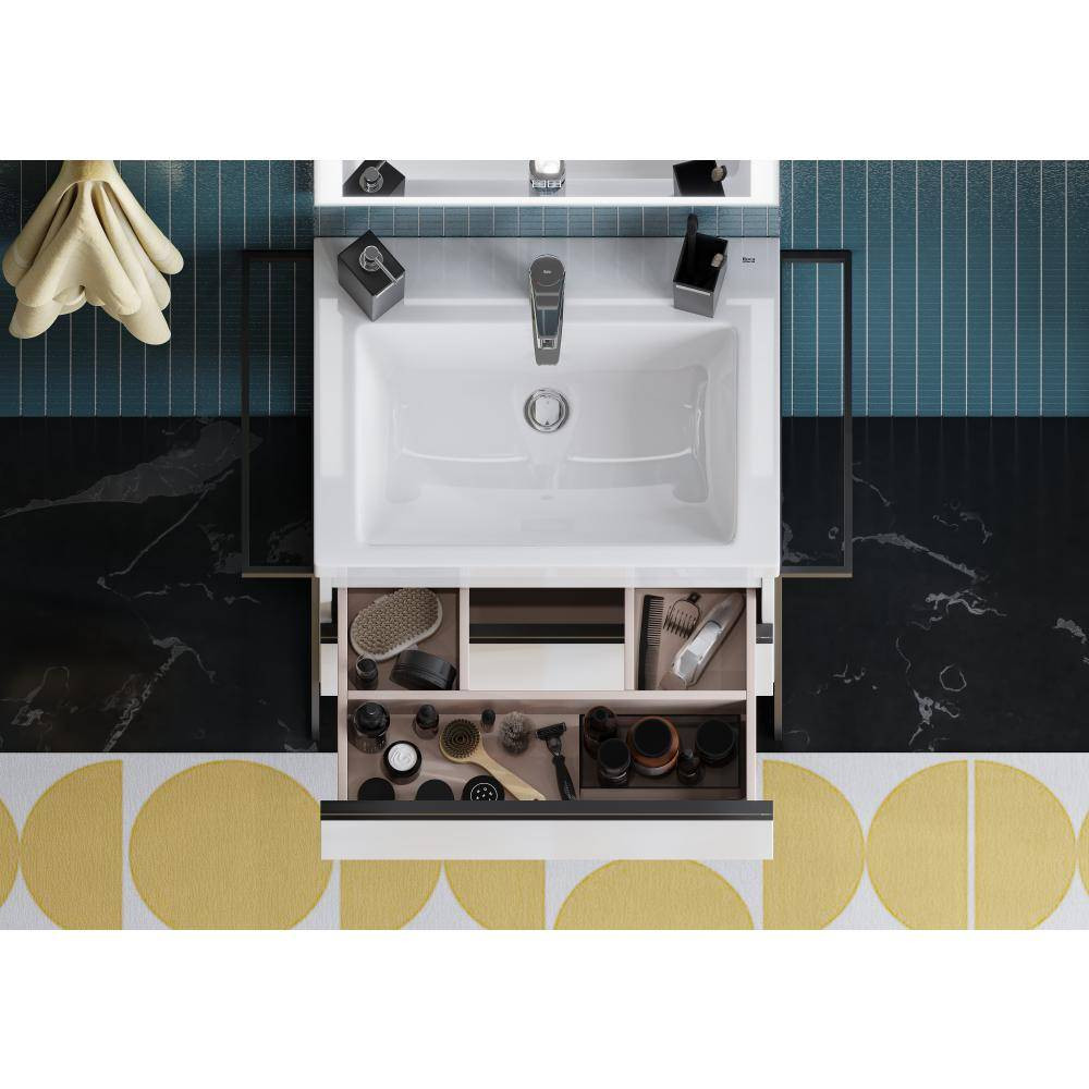 Пространство верхнего ящика разделено на три части, что позволяет хранить предметы для ванной комнаты в идеальном порядке.