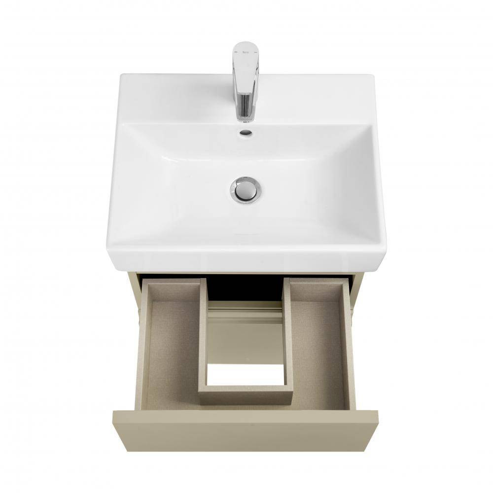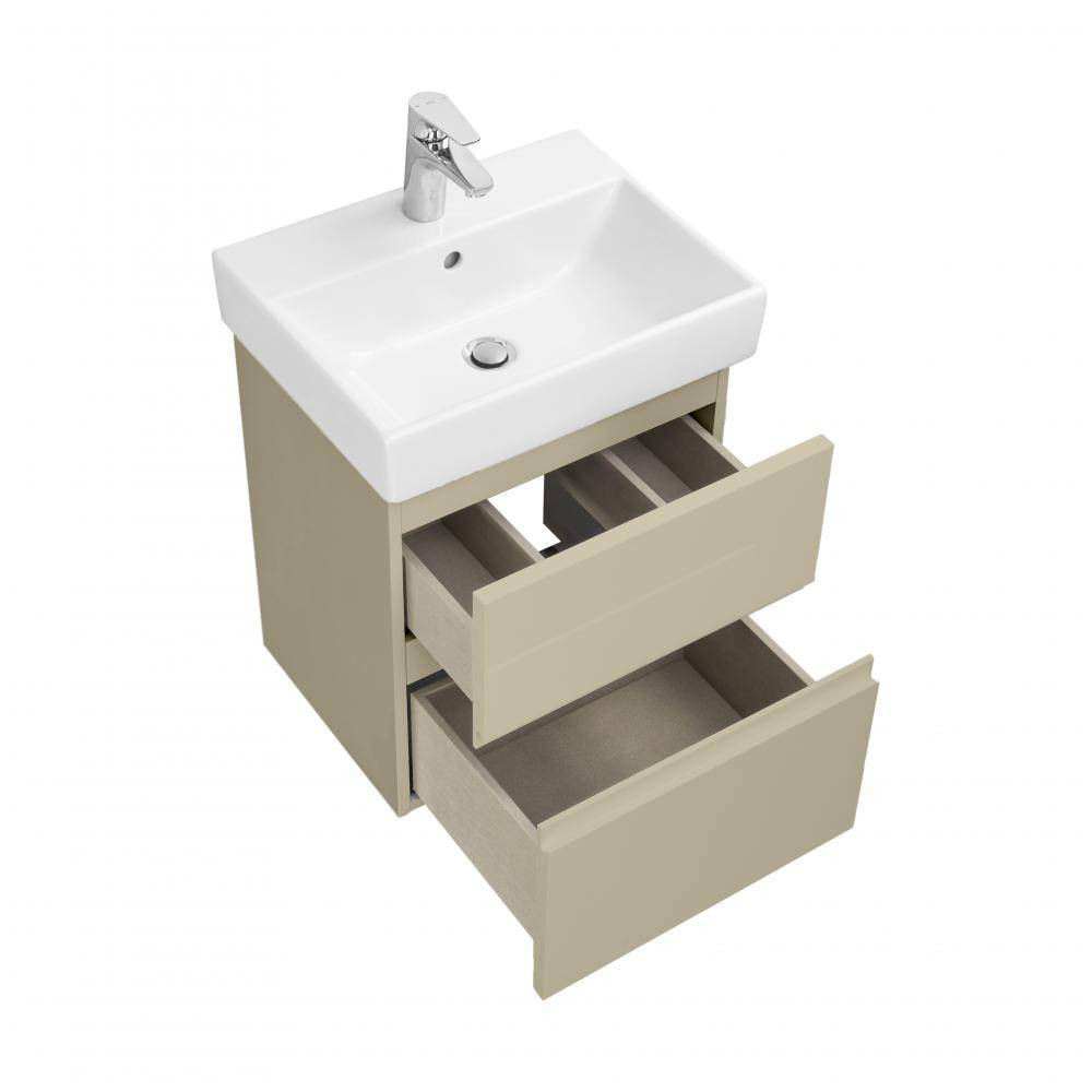 2 выдвижных ящика тумбы установлены на направляющие Hettich, которые гарантируют продолжительную безупречную функциональность и максимальный комфорт эксплуатации. Скрытый монтаж не портит элегантный дизайн мебели, а возможность полного выдвижения обеспечит быстрый доступ к необходимым предметам. Внутренняя отделка ящиков выполнена в цвете бежевый текстиль, приятна на ощупь и предотвращает скольжение предметов. Профильная ручка во всю ширину фасада удобна в использовании и позволяет сочетать мебель Oleta c различными цветами смесителей и аксессуаров для ванной комнаты. Ручка выполнена в виде J-профиля.
