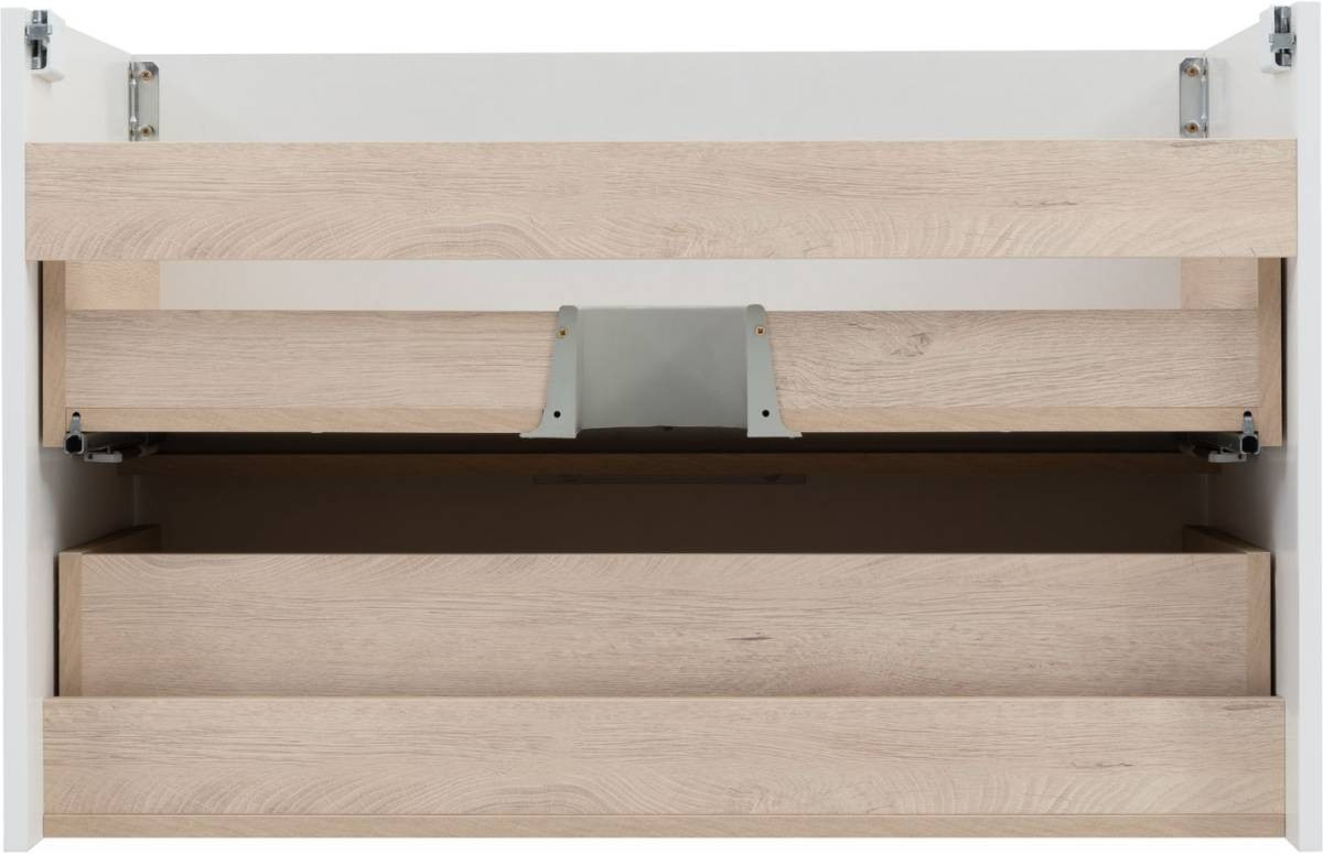 Особое внимание уделено безопасности: скругленные углы раковины и мебели минимизируют риск травм, что особенно важно в семьях с детьми. Направляющие скрытого монтажа с доводчиком обеспечивают плавное и бесшумное закрытие дверец, что добавляет комфорта в повседневное использование.