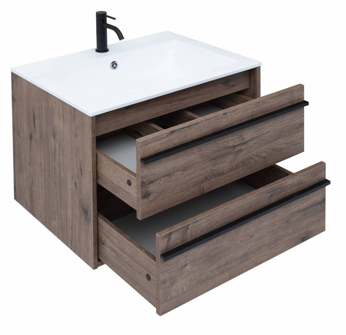 Тумба с раковиной Aquanet Lino 70 в цвете "дуб веллингтон" - яркий пример мебели в эко-стиле. Яркая, приятная глазу цветовая гамма плюс текстурная поверхность, максимально приближенная по тактильным ощущениям к натуральной древесной поверхности, является визитной карточкой коллекции. У нее удобная зона хранения: два выдвижных ящика, оборудованных доводчиками, словно утоплены внутрь корпуса. Тонкие изящные ручки во всю ширину ящиков. Именно они находятся в одной плоскости с боковыми стенками. Выглядит стильно. К тому же, безопасно, так как нет выступающих деталей. Кстати, ручки отечественного производства. Сделаны из алюминия, чтобы исключить возможность коррозии, по заказу Aquanet специально для этой коллекции. Сверху на них нанесено эмалевое покрытие. Корпус и фасады тумбы шириной 70 см – из влагостойкого ЛДСП. Сверху установлена раковина «Электра» из литьевого мрамора. У нее максимально глубокая и объемная чаша, но все внутренние детали скруглены, так что приведение ее в порядок не составит труда, так как грязь не будет скапливаться в уголках.